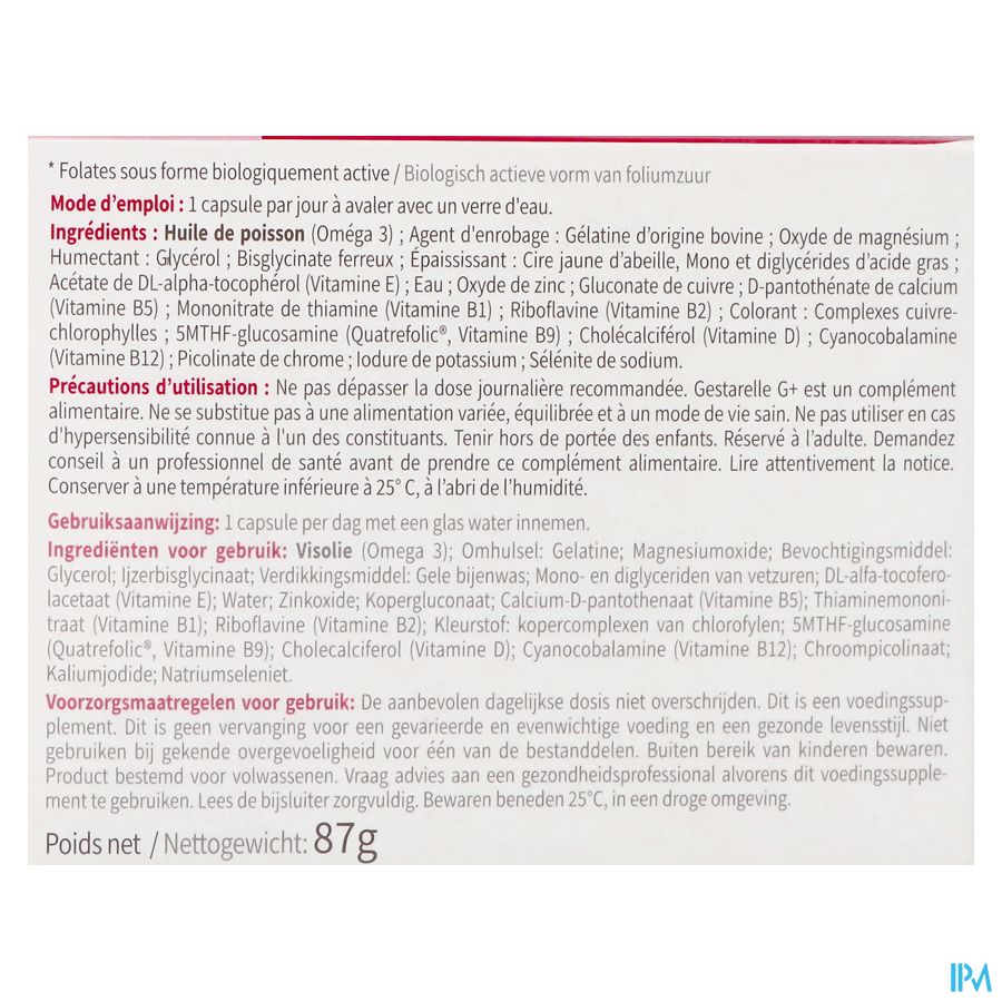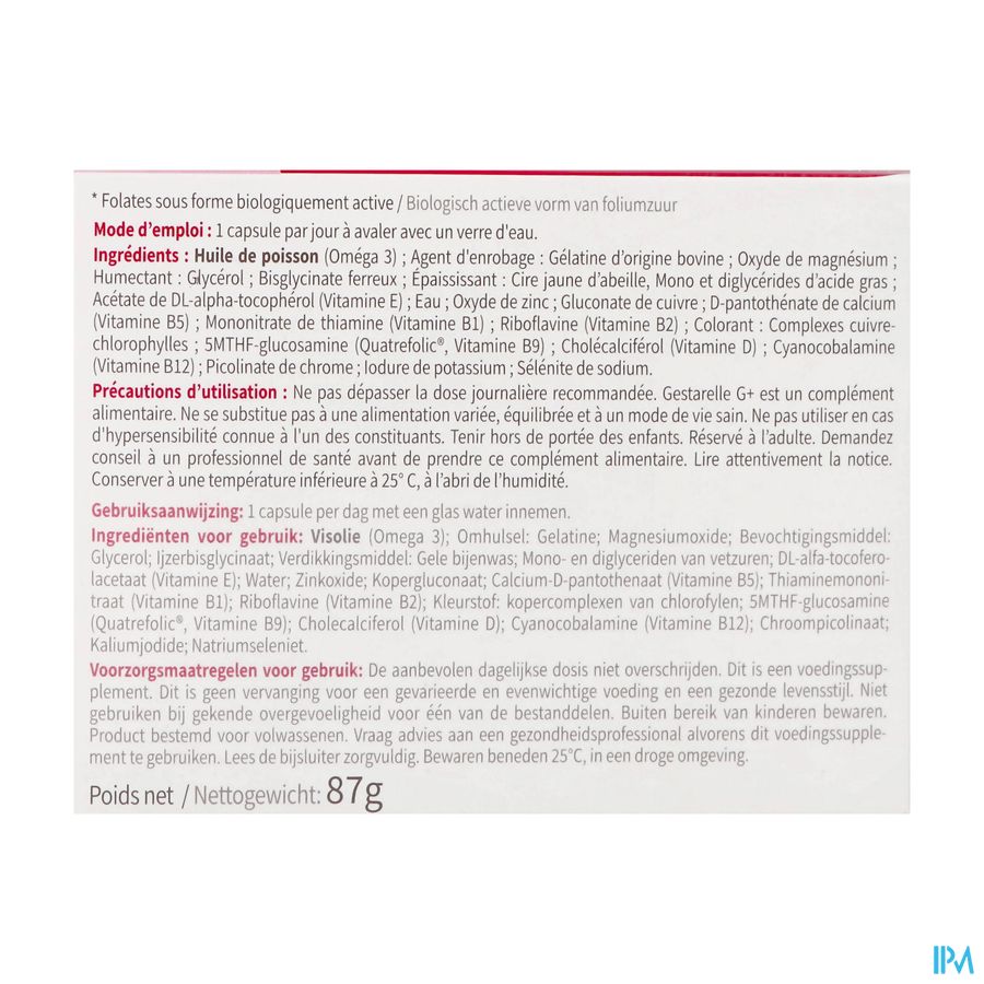 Met één capsule per dag levert Gestarelle G + ook vele andere essentiële elementen, zoals vetzuren (gezuiverde en gestabiliseerde Omega 3 uit visolie), jodium, ijzer en vitamines.