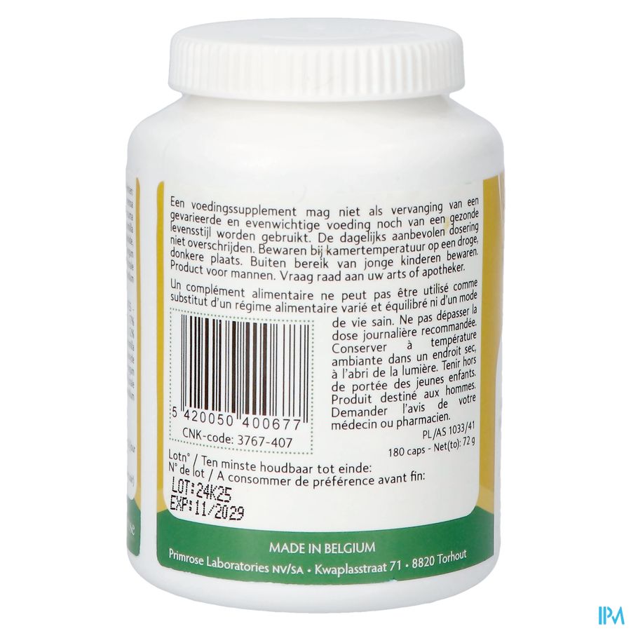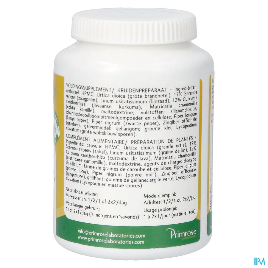 Wilde kamille, lijnzaad, zaagpalm, Javaanse geelwortel, grote brandnetel. Hulpstoffen: maltodextrine, colloïdaal siliciumdioxide, groene klei, johannesbroodpitmeelpoeder, Lycopodium clavatum (sporen van clubmos) en microkristallijne cellulose. Capsule omhulsel: hydroxypropylmethylcellulose.