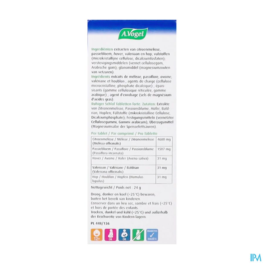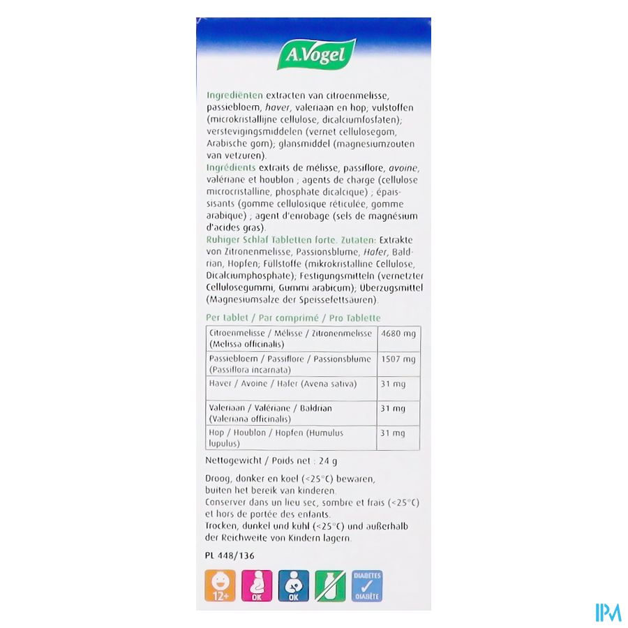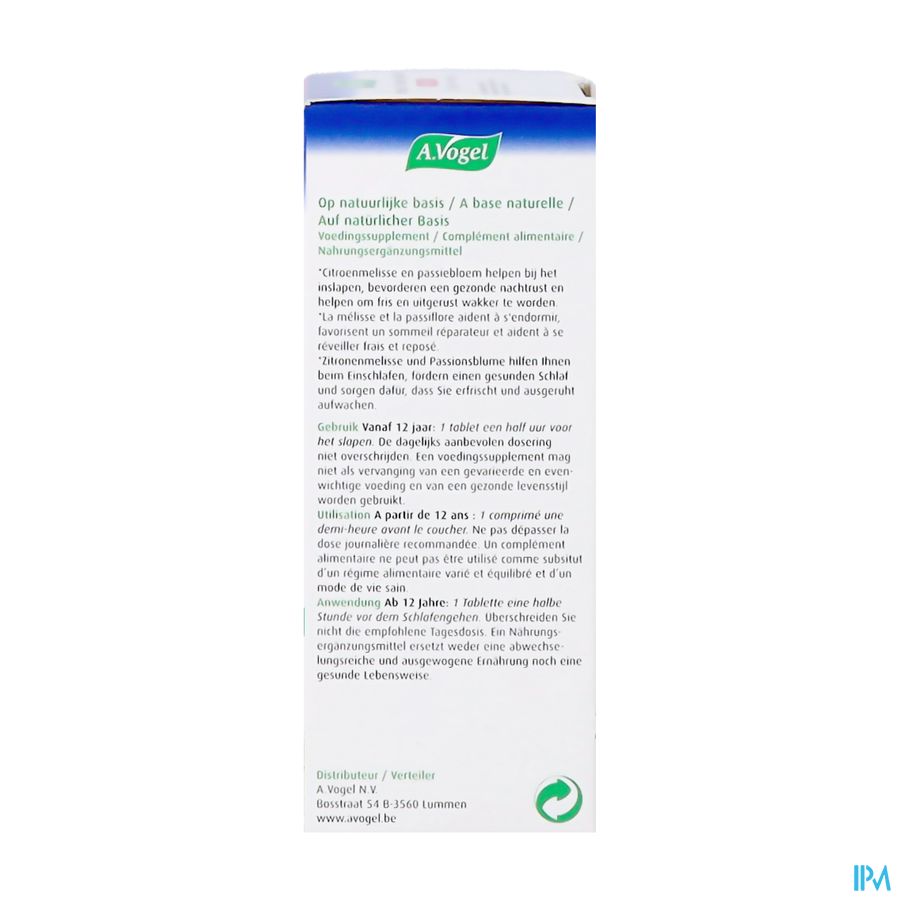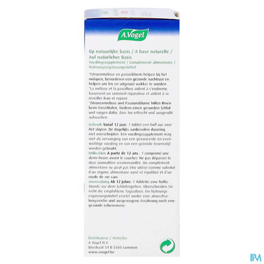 Plantenextracten: citroenmelisse (Melissa officinalis) 4680 mg, passiebloem (Passiflora incarnata) 1507 mg, haver (Avena sativa) 31 mg, valeriaan (Valeriana officinalis) 31 mg, hop (Humulus lupulus) 31 mg; vulstoffen (microkristallijne cellulose, dicalciumfosfaten); verstevigingsmiddel (vernet cellulosegom); glansmiddel (magnesiumzouten van vetzuren).