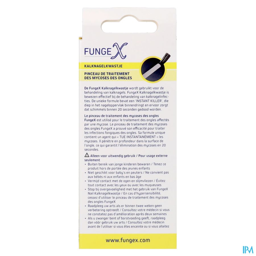 FungeX Kalknagelkwastje is alleen bedoeld voor uitwendig gebruik. Breng het product twee keer per dag aan op het aangetaste gebied (bijvoorbeeld 's ochtends en 's avonds) totdat de kalknagel volledig is uitgegroeid. Dankzij de 'instant kill'-formule van 20 seconden raakt de applicatorborstel niet geïnfecteerd met de schimmels, waardoor infectie/herinfectie van de andere nagels wordt voorkomen en de schimmels niet kunnen terugkeren. Het FungeX Kalknagelkwastje kan worden gecombineerd met het gebruik van orale antimycotica.