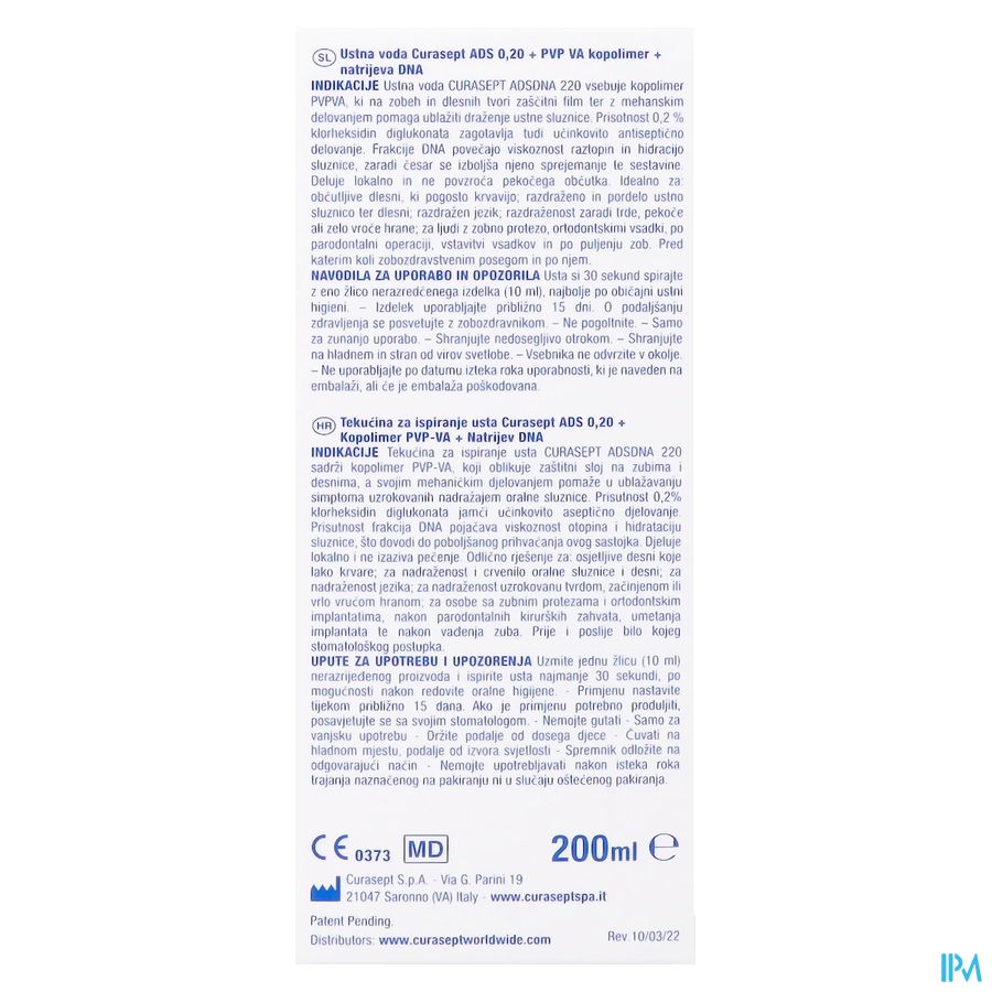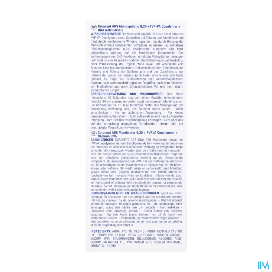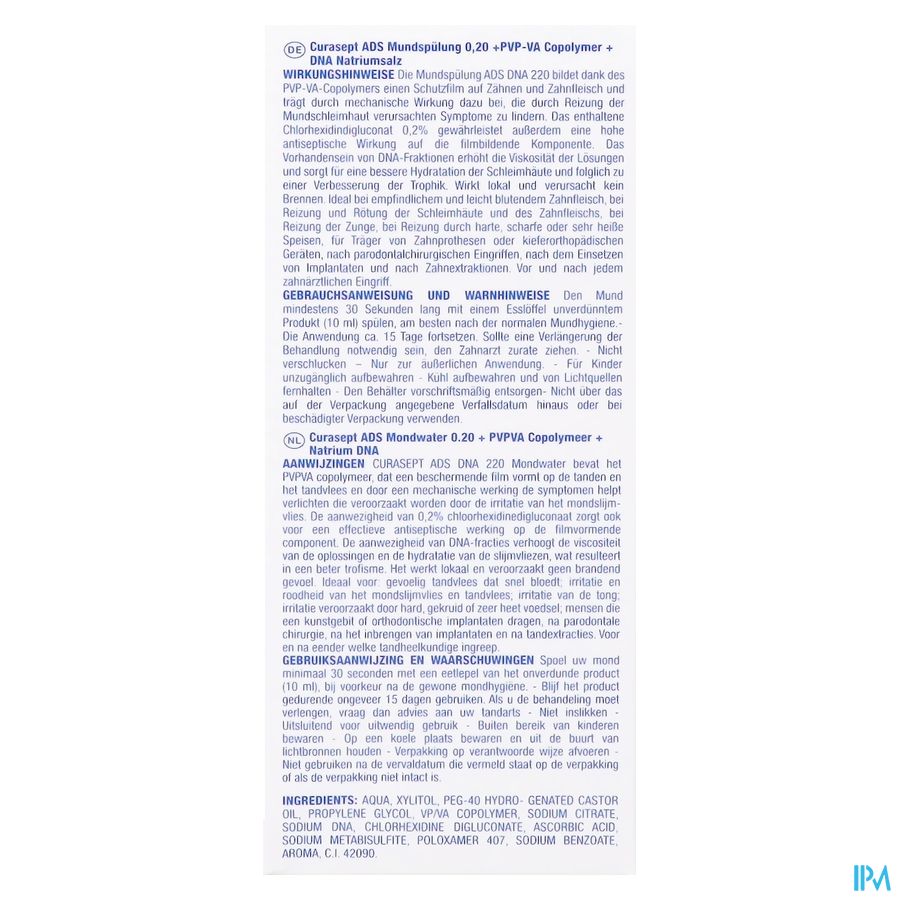 Wat Curasept ADS DNA 220 extra bijzonder maakt, is de toevoeging van DNA (natrium-DNA). Deze ingrediënten ondersteunen het regeneratieproces van het tandvlees, bevorderen wondgenezing en hebben een kalmerende werking op geïrriteerd mondweefsel.