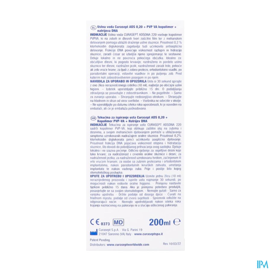 Spoel tweemaal daags gedurende 30 seconden (liefst 1 minuut) met 10 ml Curasept ADS DNA 220, na het tandenpoetsen.