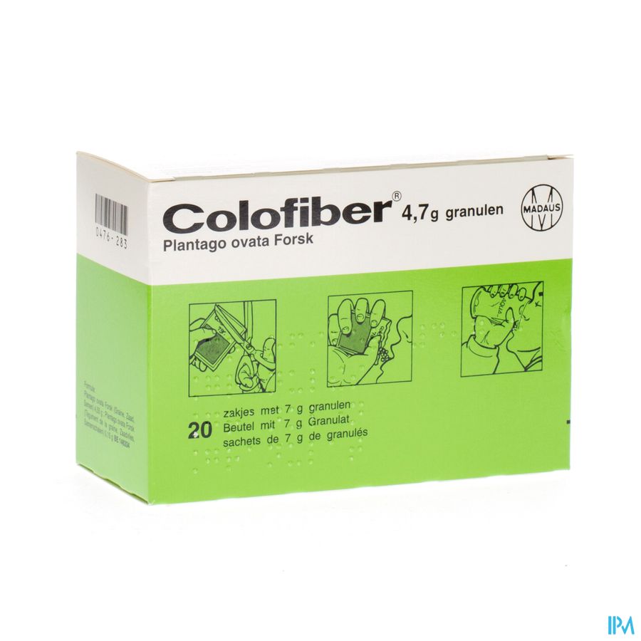 Colofiber wordt aangeboden in dozen van 20 zakjes met in elk zakje 7g korrels, de inname gebeurt via de mond.