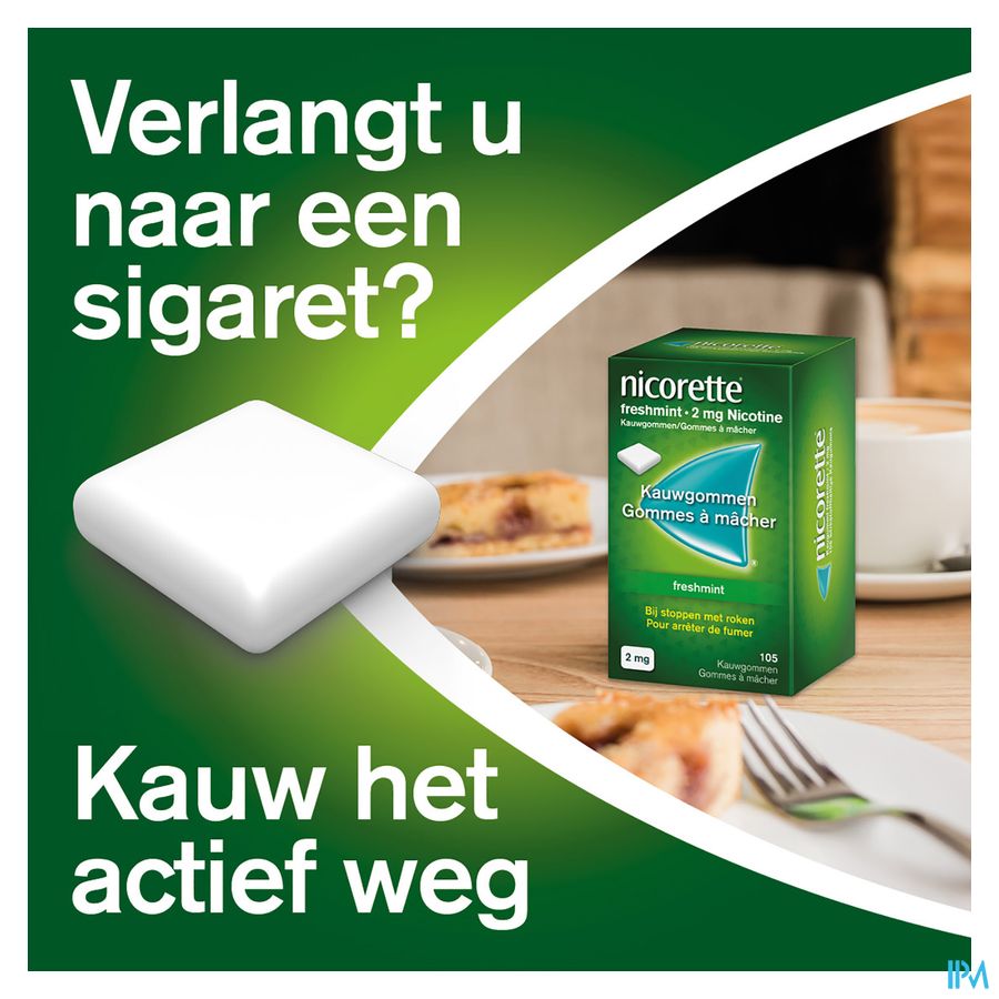 Nicorette® Freshmint Kauwgom is er voor die momenten waarop u uw zin om te roken wilt onderdrukken. Nicorette® Kauwgom Freshmint is een aangewezen methode om zowel onmiddellijk als geleidelijk aan te stoppen met roken. De nicotine in de kauwgom is voor therapeutisch gebruik en voldoende om uw ontwenningsverschijnselen onder controle te houden. Om uw rookgewoonte te doorbreken wordt een behandeling van tenminste drie maanden aanbevolen. U bouwt uw behoefte geleidelijk af en kunt stoppen wanneer 1 tot 2 kauwgoms per dag volstaan. Combineer uw wilskracht en Nicorette® Freshmint Kauwgom en zet een belangrijke stap naar een rookvrij bestaan.