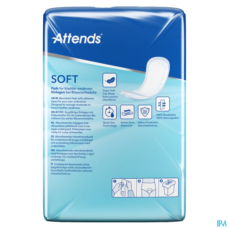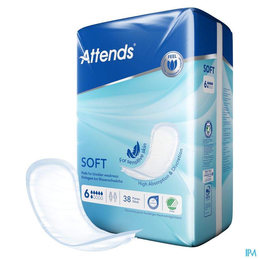 Attends Soft 6 en 7 hebben een sterk absorberende Quick-Dry tussenlaag en kern om langdurige droogheid en huidgezondheid te garanderen. Het vocht wordt raze De nieuwe Attends Soft 6 en 7 zijn comfortabele, zachte en dunne inleggers. De producten hebben een natuurlijke pasvorm voor een perfecte aansluiting op het lichaam. De zachte, elastische beschermrandjes bieden extra zekerheid tegen lekkage.