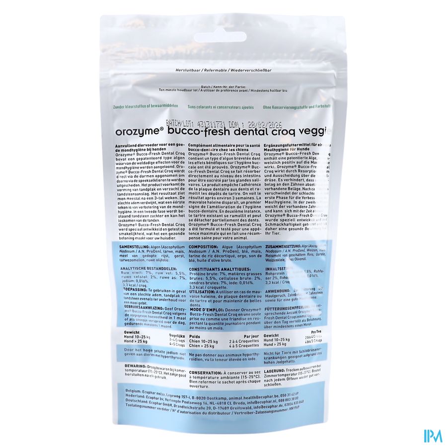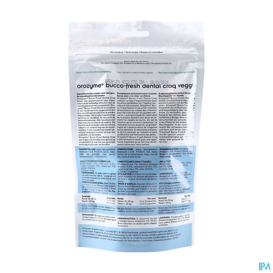 Orozyme Bucco Fresh Dental Croqs is een 100% natuurlijk aanvullend diervoeder op basis van een speciaal type algen. Deze algen zijn ook terug te vinden in . De Dental Croqs verhinderen dat tandplak zich vastzet op de tanden en verweekt de aanslag. Orozyme Bucco Fresh PlaqueOff