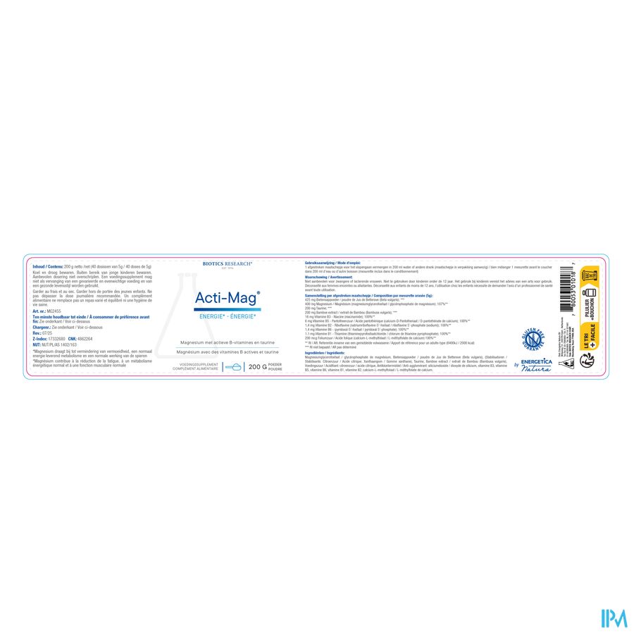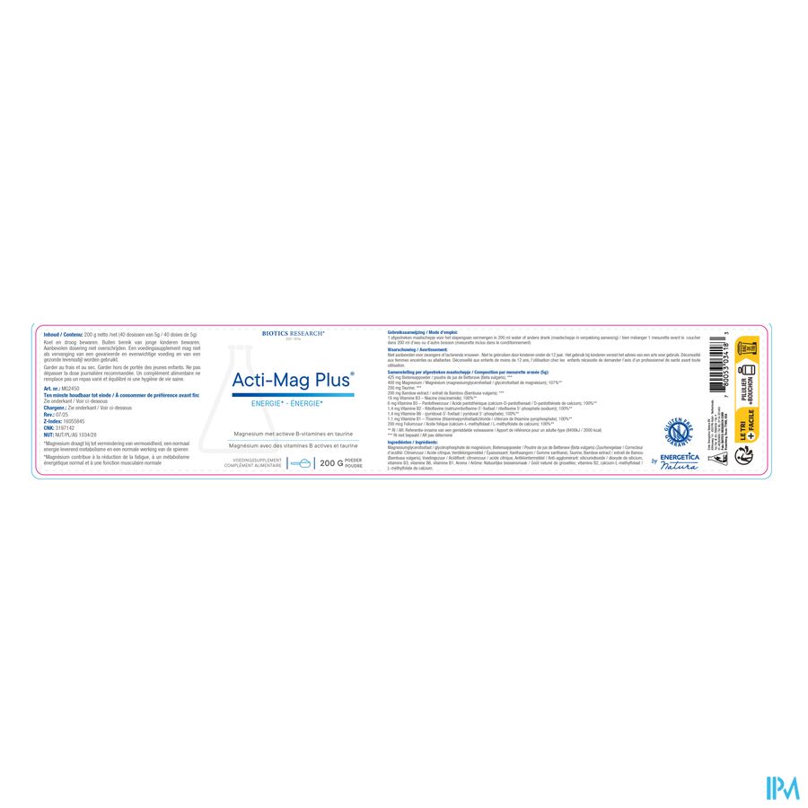 Acti-Mag plus is een magnesiumpreparaat met actieve B-vitamines en taurine. Die samenstelling zorgt voor een uitzonderlijk goede opneembaarheid en biologische beschikbaarheid van magnesium.