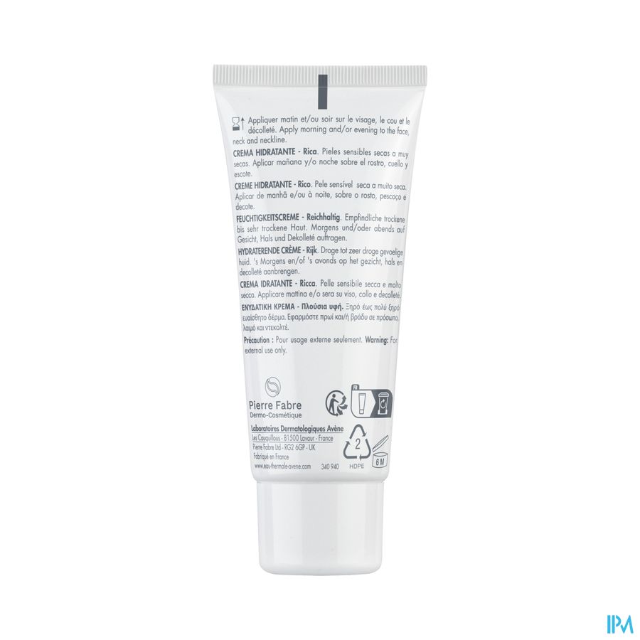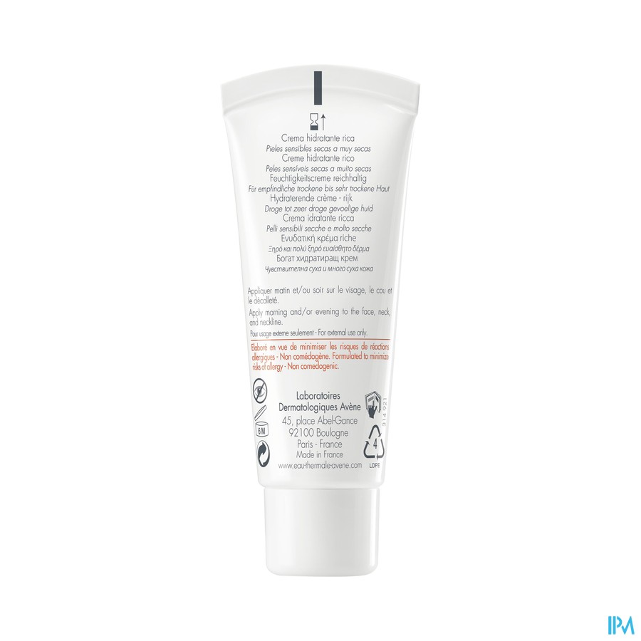 AVENE THERMAL SPRING WATER (AVENE AQUA). MINERAL OIL (PARAFFINUM LIQUIDUM). GLYCERIN. ISOHEXADECANE. DIMETHICONE. CETEARYL ALCOHOL. CARTHAMUS TINCTORIUS (SAFFLOWER) SEED OIL (CARTHAMUS TINCTORIUS SEED OIL). ISOCETYL STEAROYL STEARATE. TRIETHYLHEXANOIN. GLYCERYL STEARATE. PEG-100 STEARATE. 1,2-HEXANEDIOL. BUTYROSPERMUM PARKII (SHEA) BUTTER (BUTYROSPERMUM PARKII BUTTER). CETEARYL GLUCOSIDE. BENZOIC ACID. FRAGRANCE (PARFUM). PHYTOSTEROLS. POLYACRYLATE-13. POLYISOBUTENE. POLYSORBATE 20. SODIUM HYDROXIDE. SORBITAN ISOSTEARATE. WATER (AQUA). XANTHAN GUM