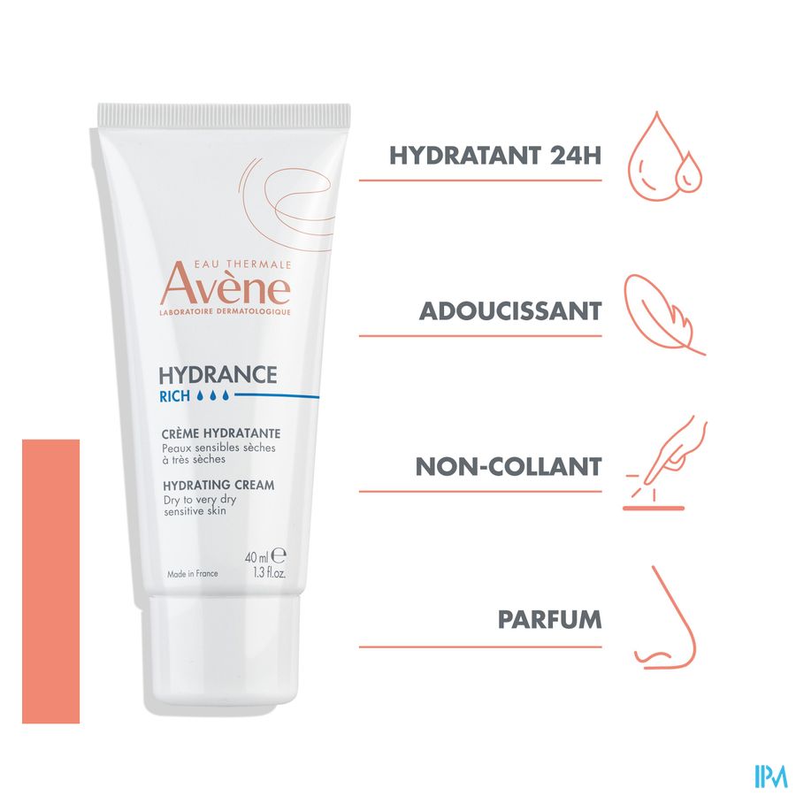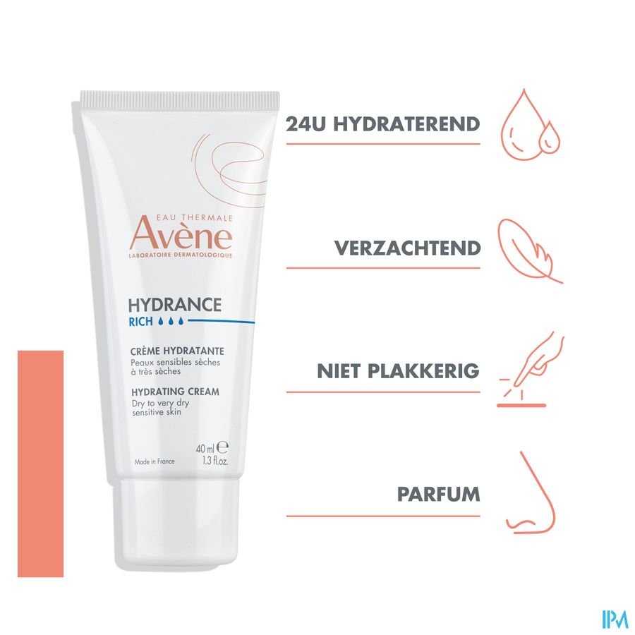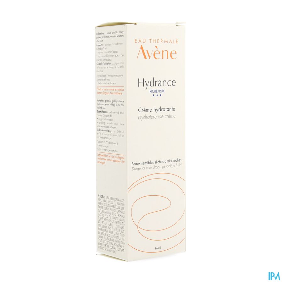 Hydrance RIJK hydraterende crème geeft de huid een navulling van Thermaal water van Avène, voor een zachte en gehydrateerde huid gedurende 24 uur. Een prettige boost van thermaal bronwater voor een gehydrateerde huid gedurende 24 uur vanaf de eerste toepassing. Hydrance RIJK hydraterende crème, bijzonder geschikt voor de gevoelige, droge tot zeer droge vochtarme huid, plakt niet en laat de huid de hele dag lang soepel en comfortabel aanvoelen. Ook verkrijgbaar met SPF 30 UV-bescherming of als BB getinte versie.