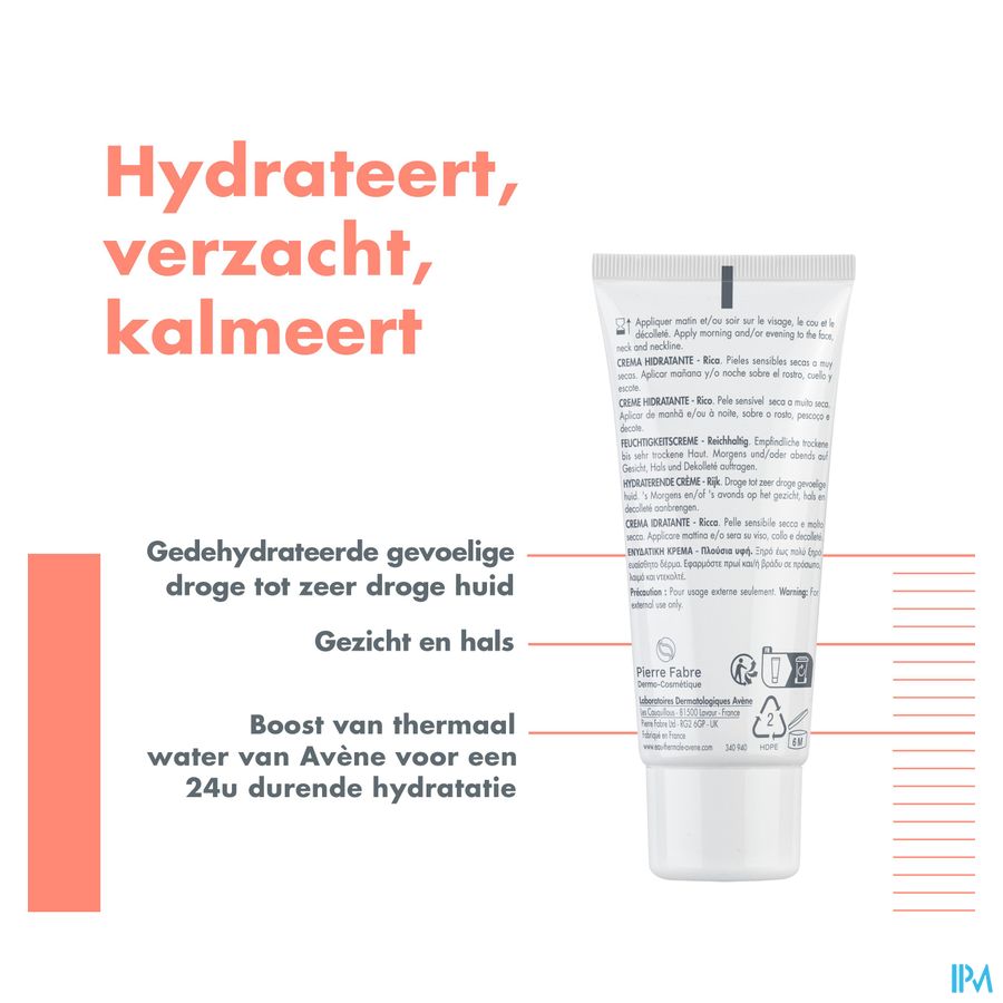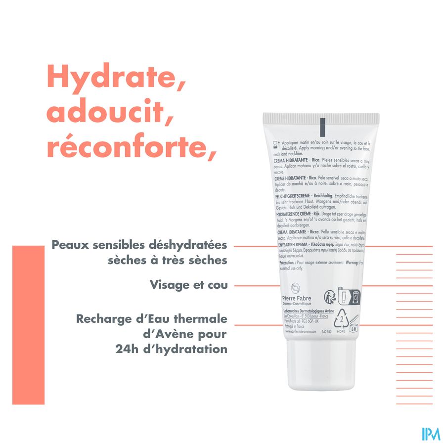 • WERKT 24 uur lang non-stop VOCHTINBRENGEND in. Het hydraterende complex zorgt ervoor dat de hoeveelheid Thermaal Water van Avène gelijk verdeeld wordt. • VERZACHT. Deze fris geurende, vochtinbrengende crème onthult een zachte, stralende huid. • De huid voelt COMFORTABEL aan. Dankzij de rijke, niet-vette textuur voelt je huid de hele dag soepel en comfortabel aan.