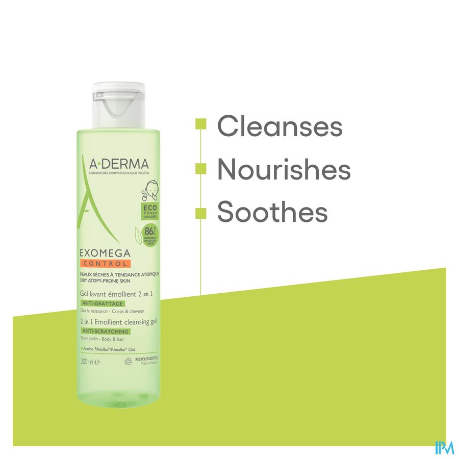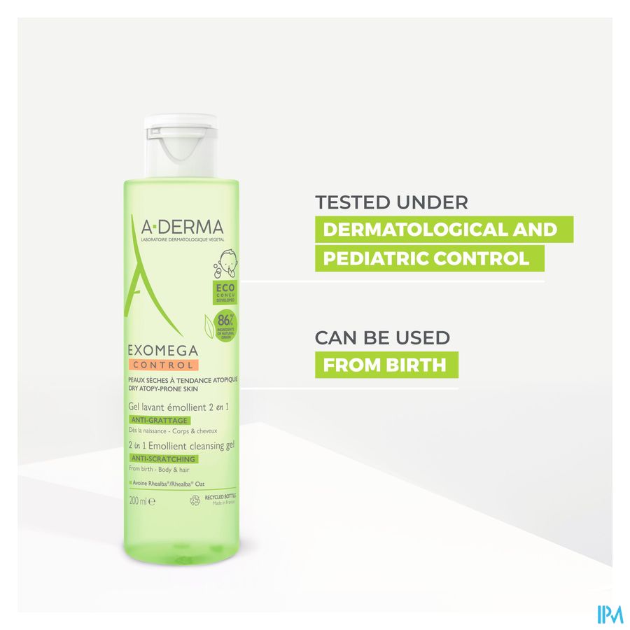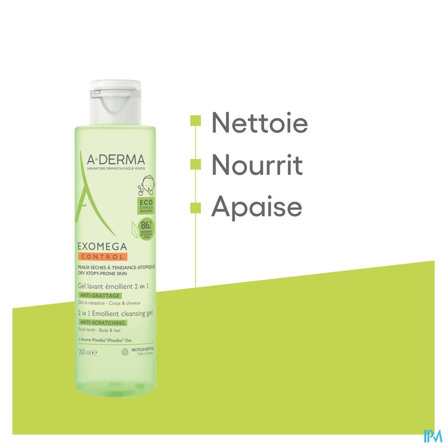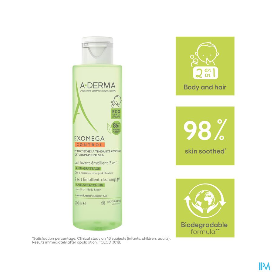 Het plantaardig dermatologisch laboratorium A-DERMA heeft EXOMEGA CONTROL 2-IN-1 EMOLLIËRENDE WASGEL samengesteld, de zachte bondgenoot voor de hygiëne van kinderen met een droge huid met neiging tot atopisch eczeem, vanaf de geboorte. In één enkele beweging reinigt deze milde, licht schuimende gel het lichaam en het haar, verzacht en beschermt de fragiele huid en hoofdhuid. Dankzij de actieve bestanddelen die streng werden geselecteerd om hun verzachtende en kalmerende eigenschappen, reinigt en hydrateert EXOMEGA CONTROL EMOLLIËRENDE WASGEL de huid en verzacht irritaties. De BIOLOGISCH AFBREEKBARE* formule, met 86% ingrediënten van natuurlijke oorsprong, is getest onder oftalmologisch, dermatologisch en pediatrisch toezicht en kan gebruikt worden vanaf de geboorte. EXOMEGA CONTROL 2-IN-1 EMOLLIËRENDE WASGEL is praktisch en maakt het leven van ouders gemakkelijker door de huid en het haar van kinderen te hullen in zachtheid en kalmerende eigenschappen.* Volgens de OESO-norm 301B
