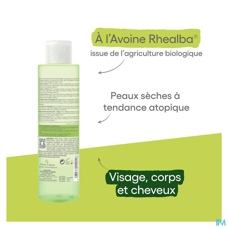 • 2-IN-1: een zachte en milde wasverzorging om lichaam, gezicht en haar te reinigen. Prikt niet in de ogen. Kan gebruikt worden op melkkorstjes. • RESPECTEERT: de BIOLOGISCH AFBREEKBARE* formule is ontwikkeld volgens het strikte 'Conscious, Clean & Green'-charter van A-DERMA en bevat 86% ingrediënten van natuurlijke oorsprong • KALMEERT: het jeukende gevoel van droge huid met neiging tot atopisch eczeem dankzij het Rhealba® Haverkiemextract.