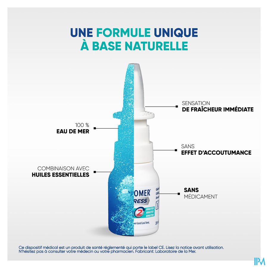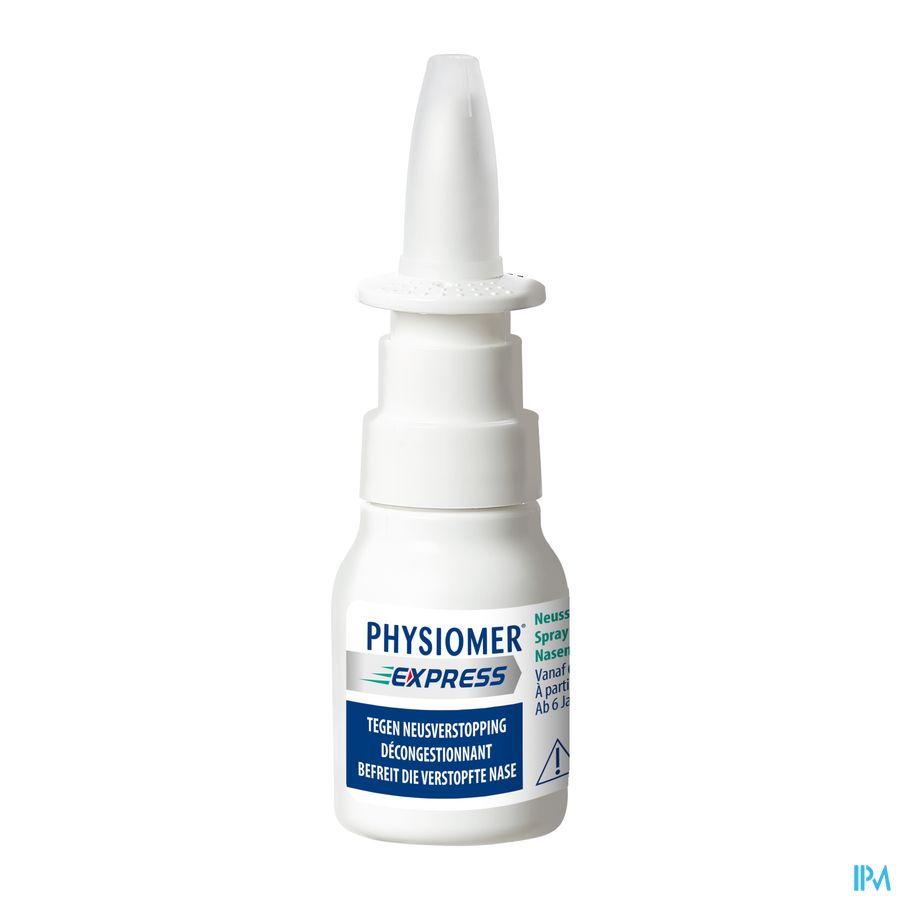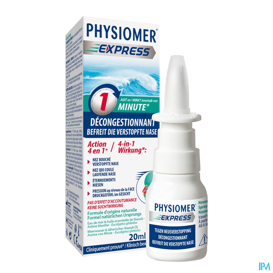 PHYSIOMER® Express is een handige neusspray in pocketformaat op basis van 100 % puur hypertonisch zeewater(3). Physiomer® Express zorgt voor onmiddellijke verlichting en maakt de verstopte neus binnen 1 minuut(1) vrij, met een uitstekende tolerantie.