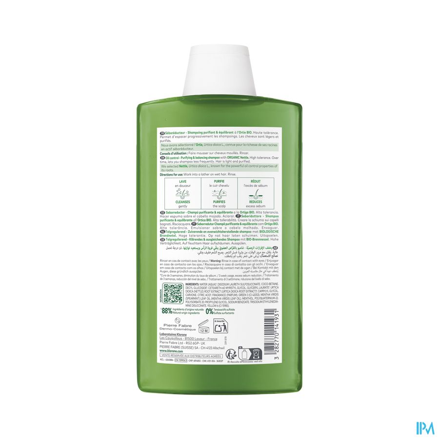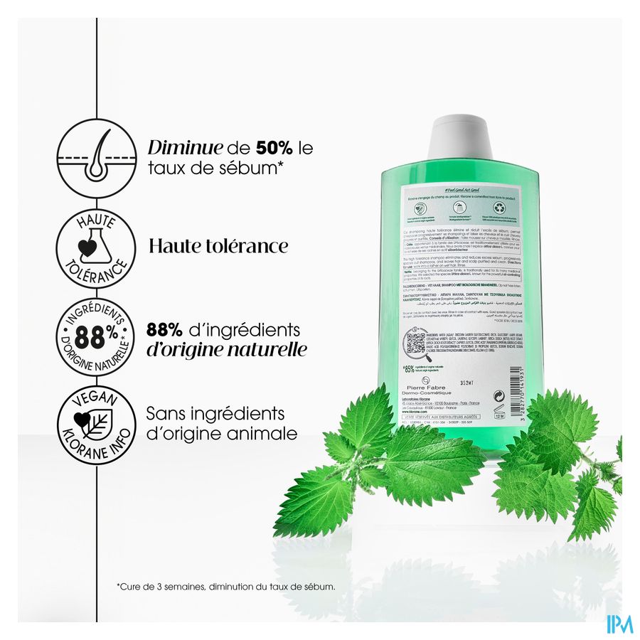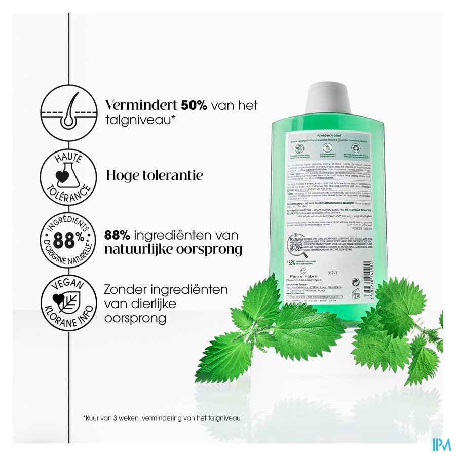 Verrijkt met Brandnetelextract, beantwoordt de Zuiverende en evenwichtsherstellende Shampoo met medicinale Brandnetel van Klorane aan de behoeften van vet haar. Dankzij de balancerende reinigende basis die de natuurlijke balans van de hoofdhuid respecteert, reinigt hij op doeltreffende wijze en vermindert hij overtollig talg, voor een schone hoofdhuid en langer luchtig haar. De balancerende en reinigende eigenschappen van deze verzorging met "blotting"-effect zijn afkomstig van witte brandnetel, waarvan de wortel bekend staat om zijn rijkdom aan talgregulerende actieve ingrediënten. Na het aanbrengen is de hoofdhuid gezuiverd en voelt het haar luchtig aan, waardoor de shampoos geleidelijk aan meer gespreid kunnen worden.