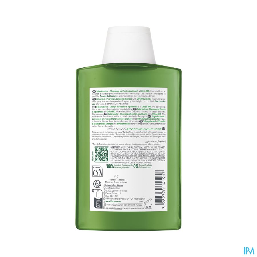 Verrijkt met Brandnetelextract, beantwoordt de Zuiverende en evenwichtsherstellende Shampoo met medicinale Brandnetel van Klorane aan de behoeften van vet haar. Dankzij de balancerende reinigende basis die de natuurlijke balans van de hoofdhuid respecteert, reinigt hij op doeltreffende wijze en vermindert hij overtollig talg, voor een schone hoofdhuid en langer luchtig haar. De balancerende en reinigende eigenschappen van deze verzorging met "blotting"-effect zijn afkomstig van witte brandnetel, waarvan de wortel bekend staat om zijn rijkdom aan talgregulerende actieve ingrediënten. Na het aanbrengen is de hoofdhuid gezuiverd en voelt het haar luchtig aan, waardoor de shampoos geleidelijk aan meer gespreid kunnen worden.