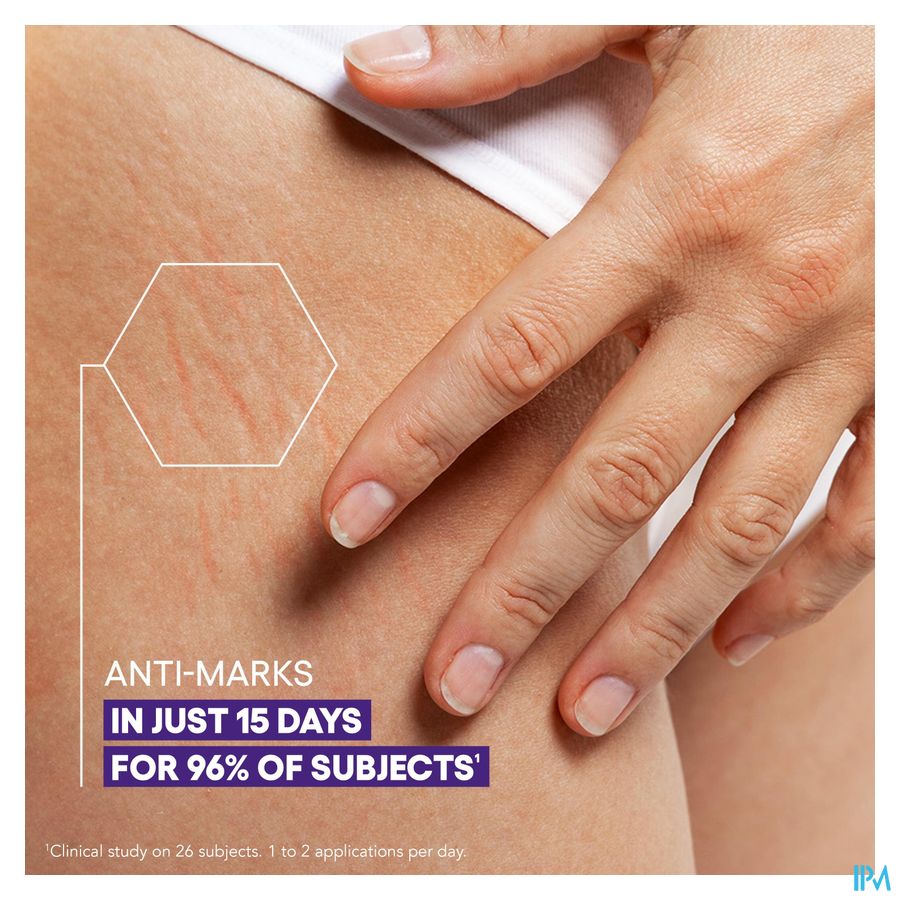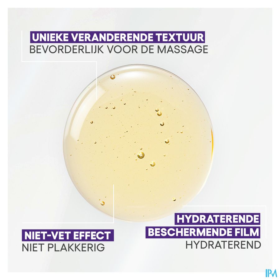 • BEVORDERT de massage: de gepatenteerde** veranderende textuur verandert van gel in olie onder de vingers, waardoor hij ideaal is voor massage - Natuurlijke massageolie. • VERBETERT de zichtbaarheid van littekens* en huidstriemen. • KALMEERT onmiddellijk en langdurig het trekkerige gevoel.