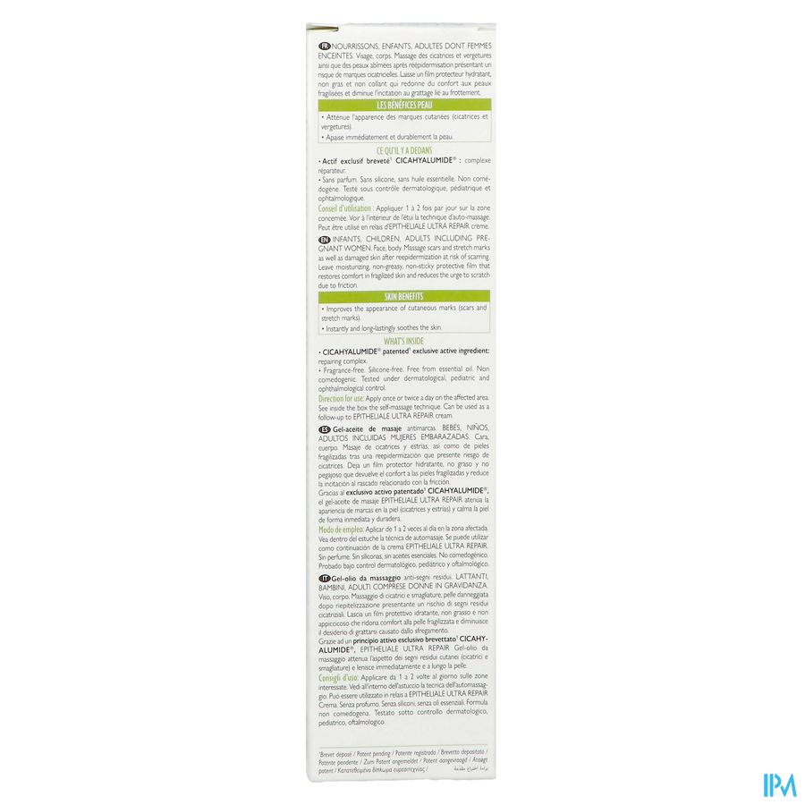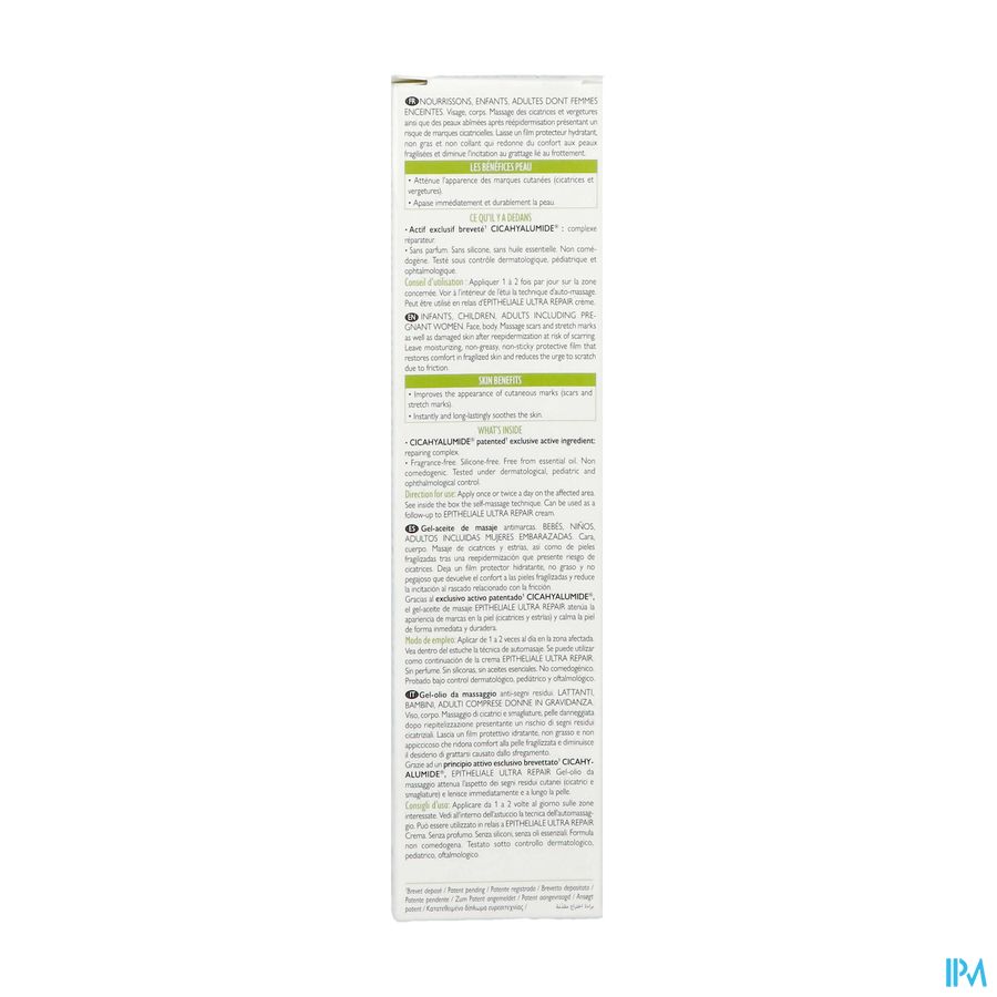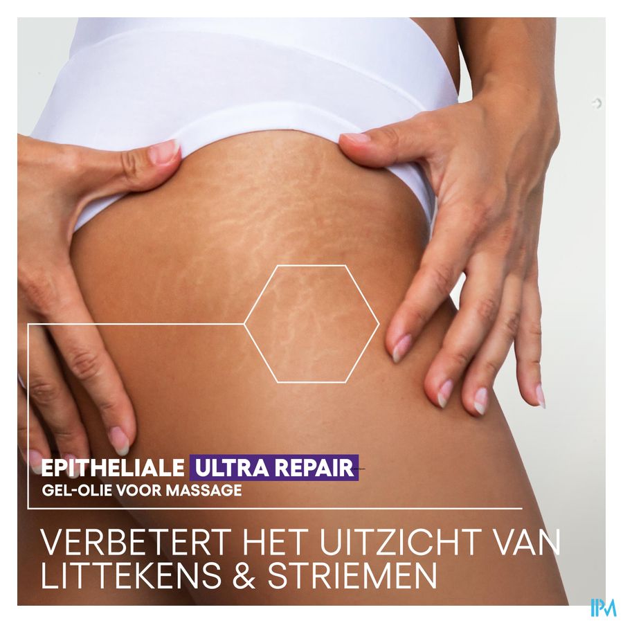 Breng deze massagegel-olie één of twee keer per dag aan om littekens* en striemen te helpen vervagen. Een gepatenteerde** gel-olietextuur die niet druipt en vloeibaar wordt tijdens de massage. Dit gebaar is aanbevolen om de microcirculatie te bevorderen en te stimuleren, de hydratatie te optimaliseren en een trekkerig en jeukend gevoel te verminderen. De formule van de EPITHELIALE ULTRA REPAIR massagegel-olie bevat geen silicone en essentiële oliën en bestaat uit slechts negen ingrediënten, waarvan 98% van natuurlijke oorsprong is. Het verbetert het uitzicht van de vlekken op de huid bij 100% van de proefpersonen¹. Deze gel-olie kan gebruikt worden als zwangerschapsolie tegen striemen. Het is geschikt om zwangerschapsstriemen te voorkomen en te verminderen en biedt een zachte verzorging voor de huid van moeders in spe, maar is ook ideaal voor het hele gezin. Rhealba® haver van biologische teelt. Vegan Info: bevat geen ingrediënten van dierlijke oorsprong.