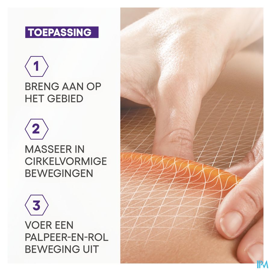 Breng een- of tweemaal per dag aan op de aangetaste zone (littekens, striemen). Masseer de huid gedurende enkele minuten, eerst met cirkelvormige bewegingen en vervolgens met een massage geïnspireerd op de klop-rolmassage.