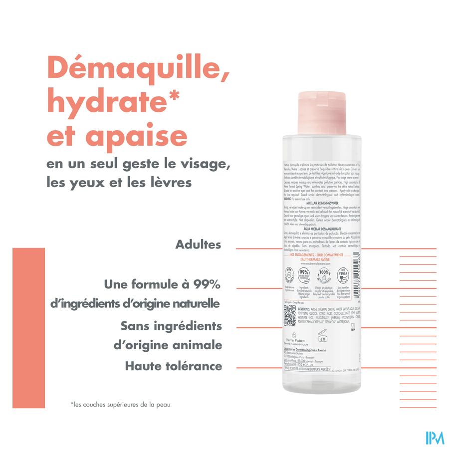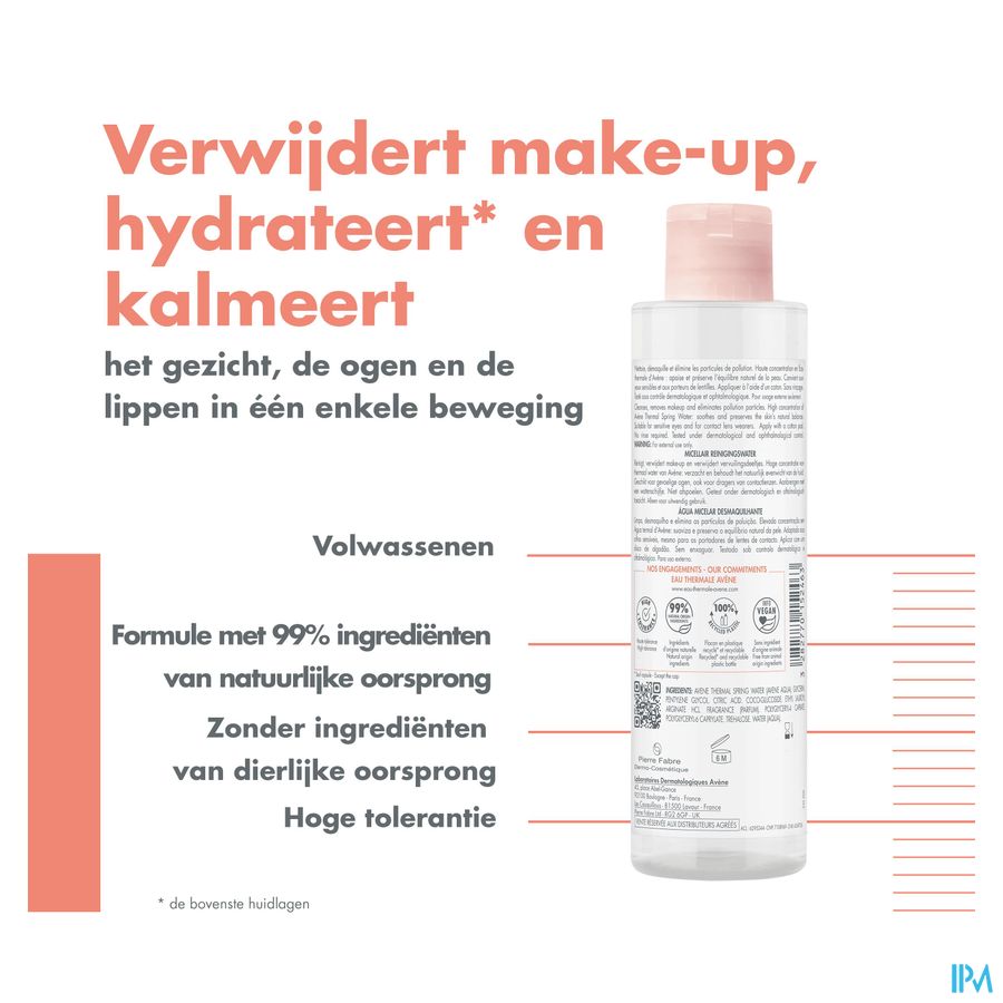 Deze micellaire make-upremover reinigt (en ontdoet de huid van vervuilingsdeeltjes *), hydrateert** en kalmeert het gezicht en de gevoelige ogen in één enkele beweging. Hij bevat 99% ingrediënten van natuurlijke oorsprong en bevat geen ingrediënten van dierlijke oorsprong. De huid is schoon, zacht, gekalmeerd en comfortabel. Dit frisse, subtiel geparfumeerde water verwijdert make-up en maakt de huid zacht in één eenvoudige en snelle beweging. Het verbetert de hydratatie en behoudt het natuurlijke evenwicht van de huid dankzij de combinatie van glycerine, trehalose en een hoge concentratie thermaal water van Avène met kalmerende eigenschappen. De formule bevat enkel de strikt noodzakelijke ingrediënten in de juiste hoeveelheid, om dermatologische doeltreffendheid en tolerantie te garanderen***. Het Micellair reinigingswater is geschikt voor dragers van contactlenzen. De verpakking van het Micellair reinigingswater 400 ml bevat 87% gerecycled materiaal. Het flesje is gemaakt van 100% gerecycled plastic****.