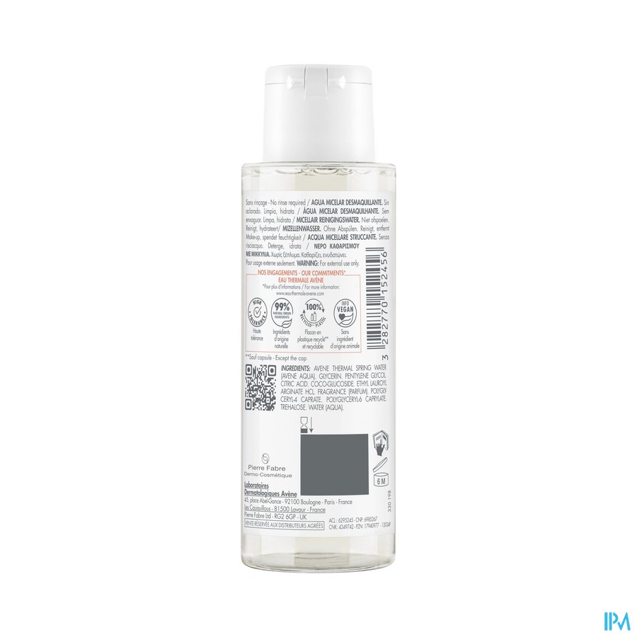 Deze micellaire make-upremover reinigt (en ontdoet de huid van vervuilingsdeeltjes *), hydrateert** en kalmeert het gezicht en de gevoelige ogen in één enkele beweging. Hij bevat 99% ingrediënten van natuurlijke oorsprong en bevat geen ingrediënten van dierlijke oorsprong. De huid is schoon, zacht, gekalmeerd en comfortabel. Dit frisse, subtiel geparfumeerde water verwijdert make-up en maakt de huid zacht in één eenvoudige en snelle beweging. Het verbetert de hydratatie en behoudt het natuurlijke evenwicht van de huid dankzij de combinatie van glycerine, trehalose en een hoge concentratie thermaal water van Avène met kalmerende eigenschappen. De formule bevat enkel de strikt noodzakelijke ingrediënten in de juiste hoeveelheid, om dermatologische doeltreffendheid en tolerantie te garanderen***. Het Micellair reinigingswater is geschikt voor dragers van contactlenzen. De verpakking van het Micellair reinigingswater 400 ml bevat 87% gerecycled materiaal. Het flesje is gemaakt van 100% gerecycled plastic****.