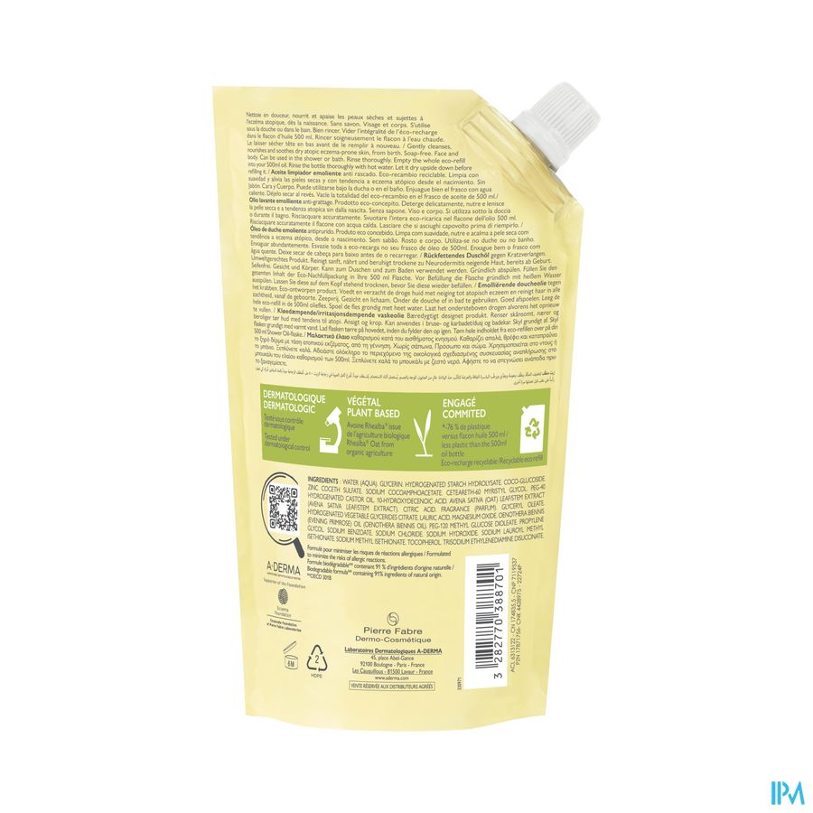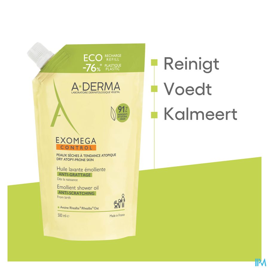 Gebruik onder de douche of in bad. Leeg de gehele eco-vulling in de 500ml oliefles. Spoel de fles grondig uit met warm water. Laat hem ondersteboven drogen alvorens hem opnieuw te vullen. Aanbrengen op de natte huid, afspoelen en drogen zonder te wrijven. Breng vervolgens uw EXOMEGA CONTROL huidverzorgingsproduct aan.