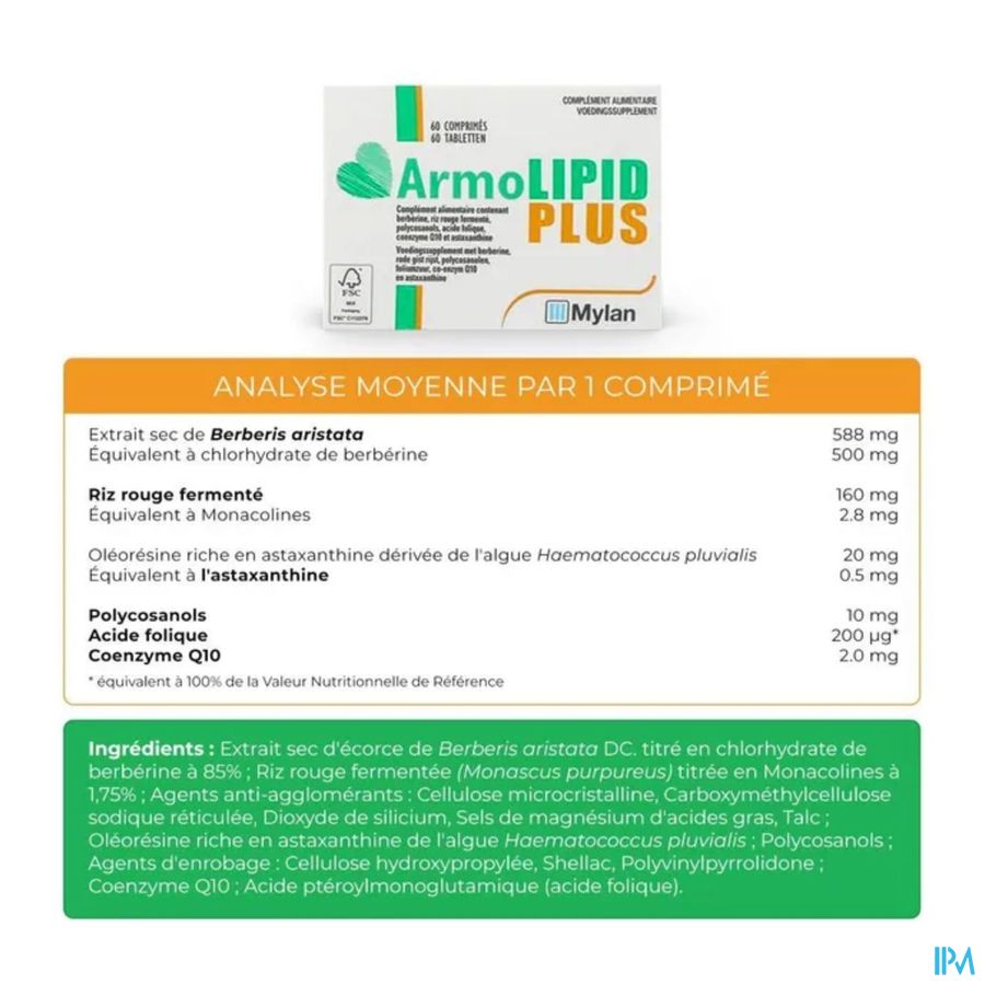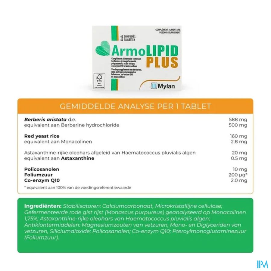 Samenstelling: Berberine, Rode gistrijst (Monascus purpureus), Polycosanolen, Foliumzuur, Co-enzym Q10, Astaxanthine-rijk oleohars.