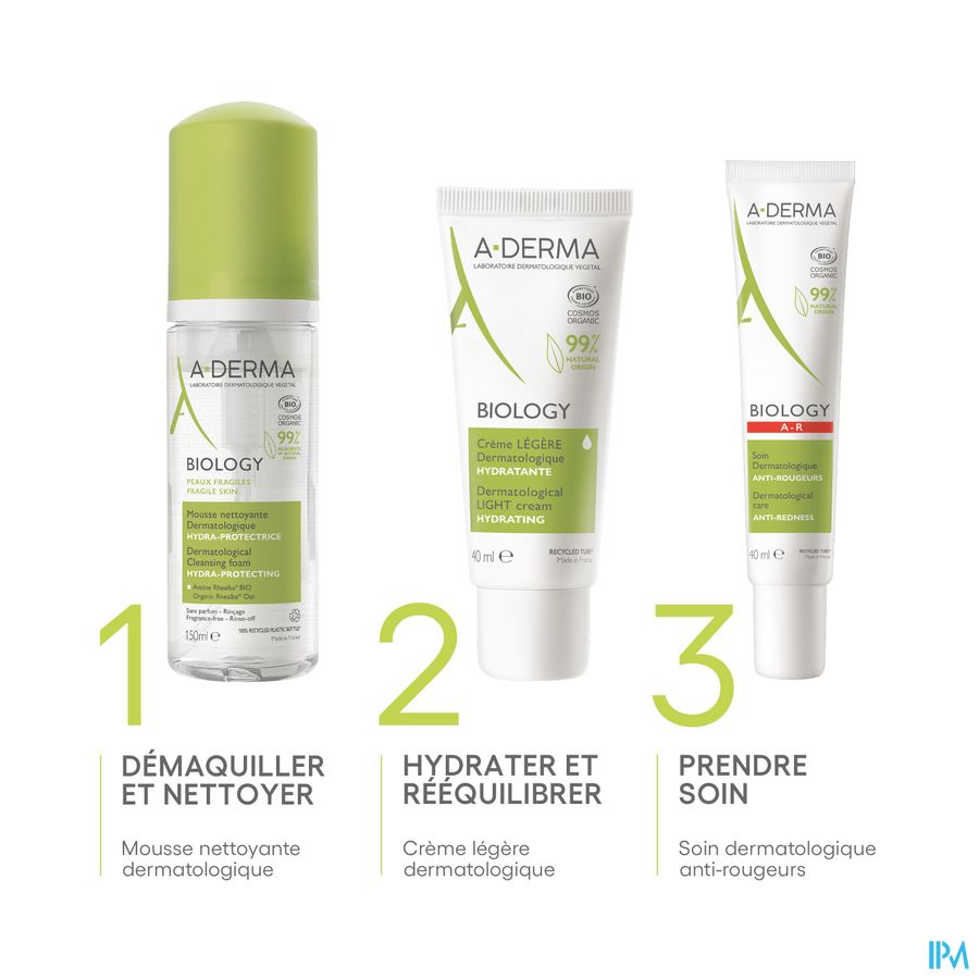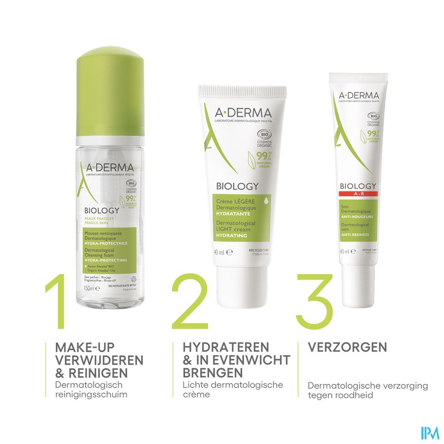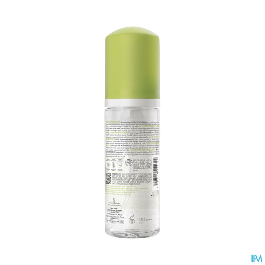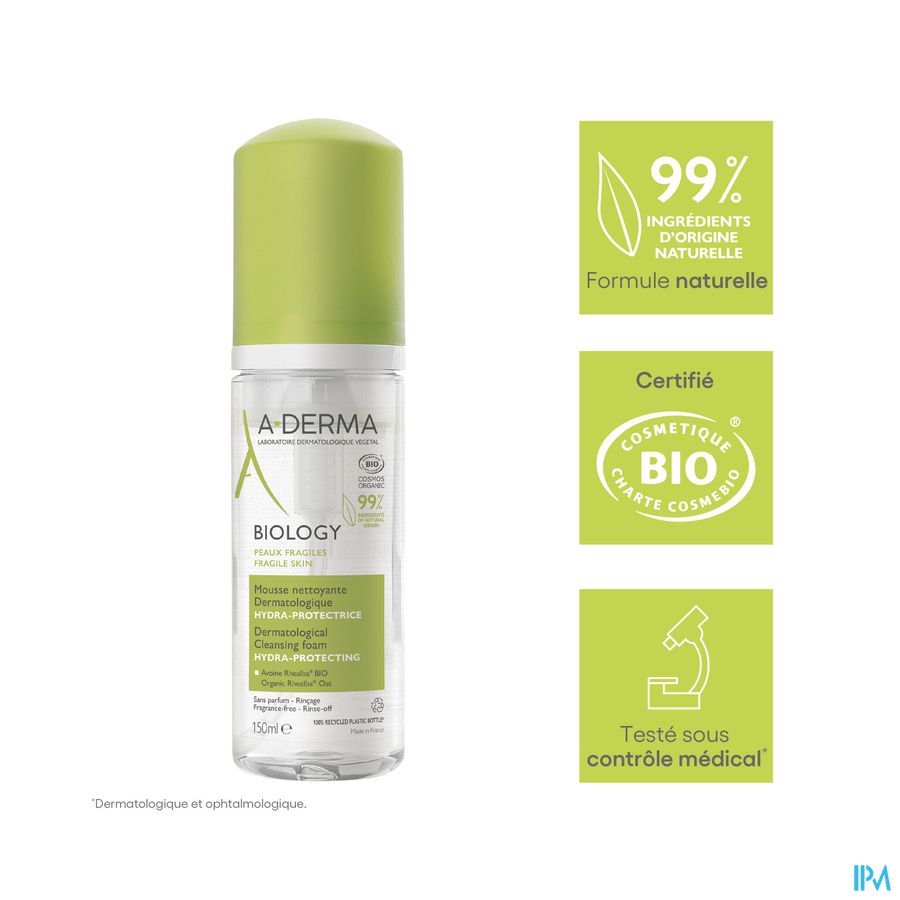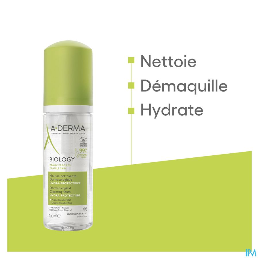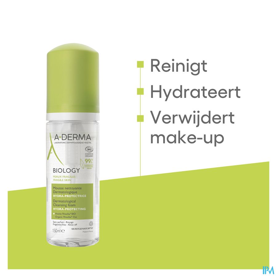 A-DERMA heeft BIOLOGY Dermatologisch hydra-beschermend reinigingsschuim geformuleerd om make-up te verwijderen en tegelijkertijd de kwetsbare huid van het gelaat doeltreffend en in alle zachtheid te reinigen. De formule bestaat voor 99% uit ingrediënten van natuurlijke oorsprong, bevat geen parfum en is zeepvrij, en combineert de hoogste normen en dermatologische doeltreffendheid met een biologische certificering voor een optimale tolerantie. De comfortabele textuur, een romig en luchtig schuim, maakt het aangenaam om elke dag te gebruiken. De formule met biologisch Rhealba® haverextract (Sap), bekend om zijn evenwichtherstellende en hydraterende eigenschappen, en met paardenbloemextract, bekend om zijn antivervuilingseigenschappen, reinigt en verwijdert vuildeeltjes en onzuiverheden, verwijdert make-up op milde wijze zonder de huid uit te drogen en hydrateert de huid. Het Hydra-beschermend schuim is getest op de allergische huid, onder dermatologische en oftalmologische controle, prikt niet in de ogen en respecteert de kwetsbare huid. Het kan 's ochtends en/of 's avonds op de vochtige huid van het gelaat worden aangebracht met zachte masserende bewegingen van de vingertoppen en vervolgens worden afgespoeld. De huid ziet er fris, schoon en stralend uit. Rhealba® Haver, afkomstig uit de biologische landbouw. Vegan Info: geen ingrediënten van dierlijke oorsprong.