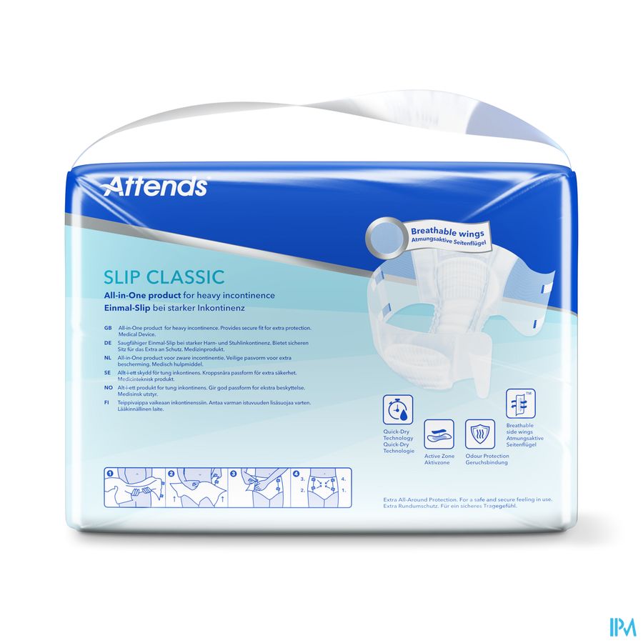Attends Slip Classic zorgt voor absolute droogheid dankzij de dubbele kerntechnologie met aquisitielaag en draagt bij aan het behoud van een gezonde huid. De Attends Slip Classic 10 M is geschikt voor mensen met een heupomvang van 80-115 cm.