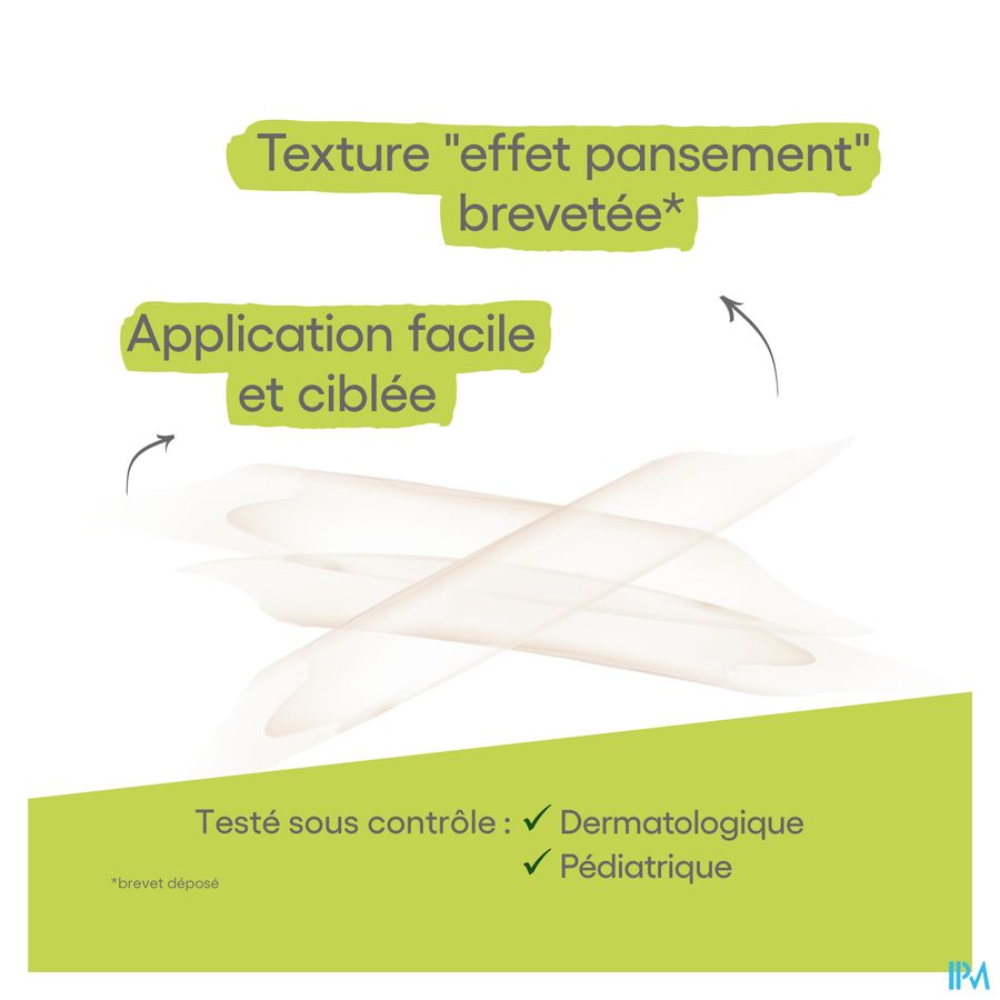 De formule bevat 2 verzachtende en kalmerende extracten: Rhealba® Haver en Kattenklauwextract, om de huid te verlichten vanaf het eerste gebruik. De applicator met metalen bolletje zorgt voor een versterkt verkoelend effect, maakt gericht aanbrengen met de juiste dosering mogelijk en houdt de handen schoon dankzij de gepatenteerde "verbandachtige" textuur die niet uitloopt.