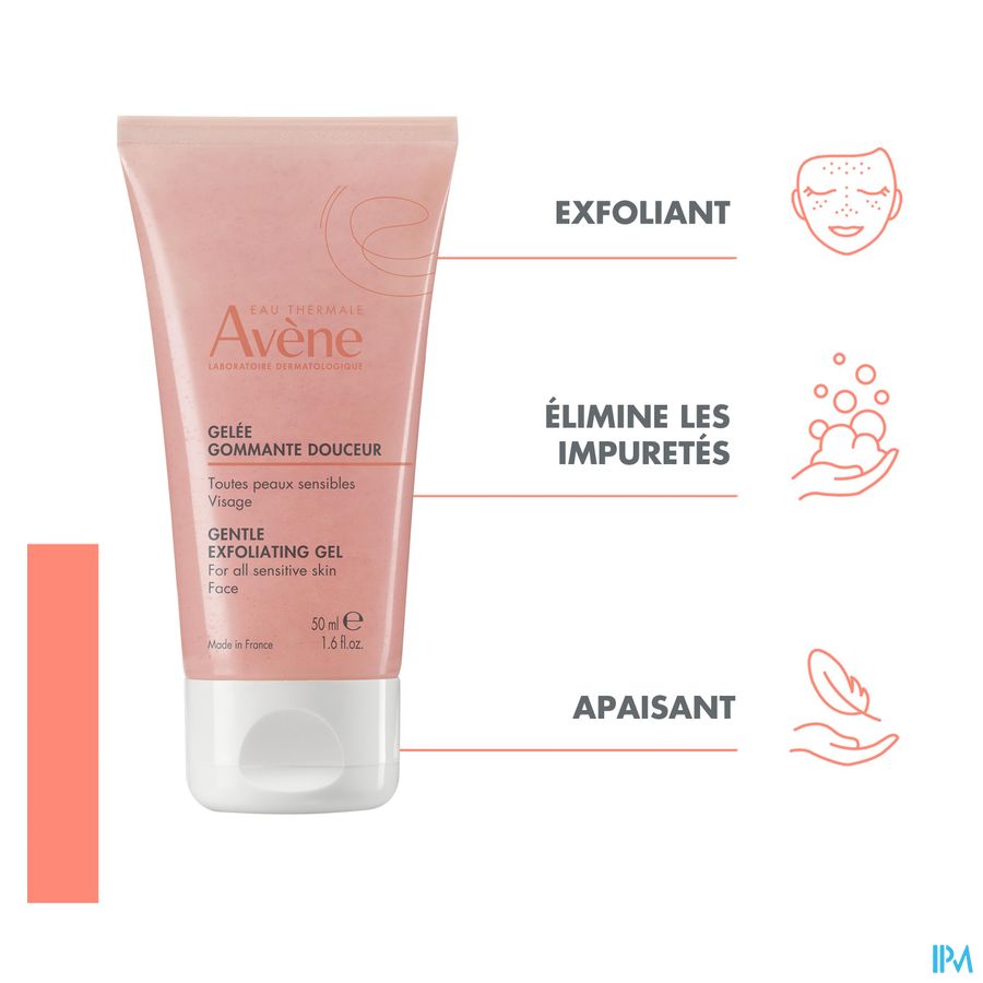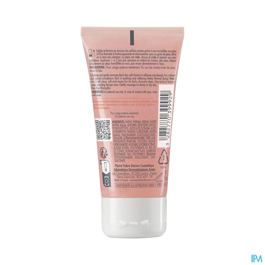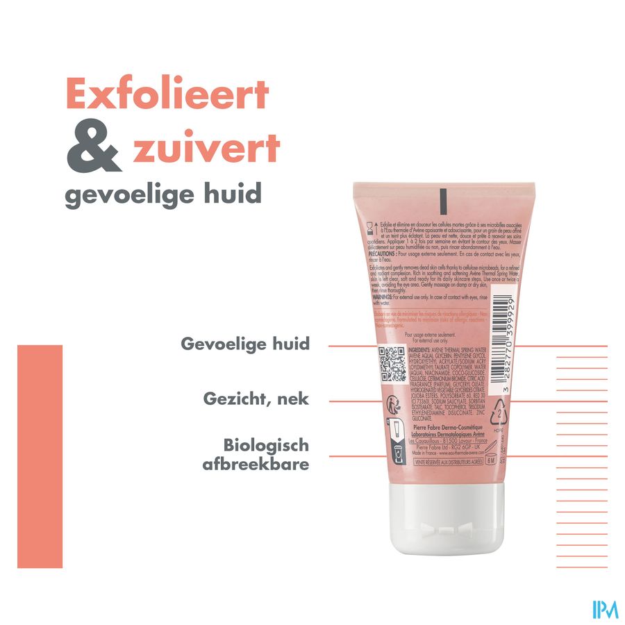 • EXFOLIEERT, dankzij de formule met microkorrels van cellulose en jojobawas. • ZUIVERT, dankzij het peeling-effect. • VERZACHT, dankzij het Thermaal water van Avène.