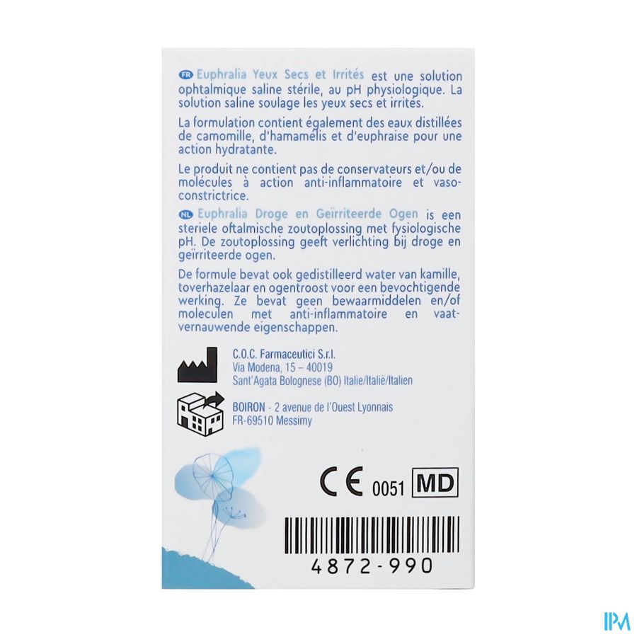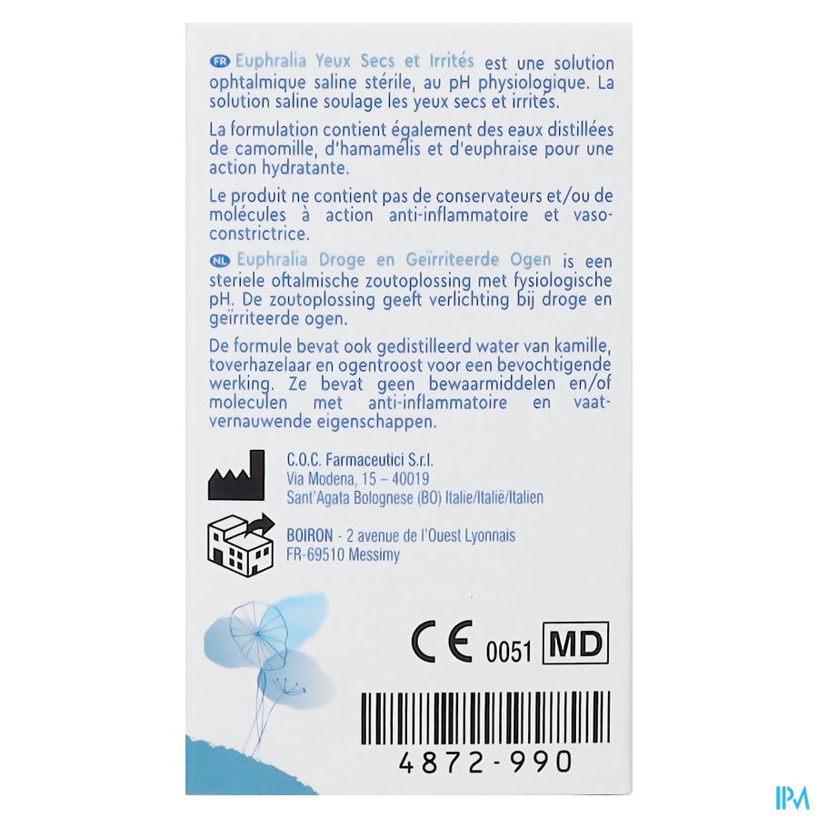 Euphralia Droge en Geïrriteerde Ogen is een steriele oftalmische zoutoplossing met fysiologische pH.