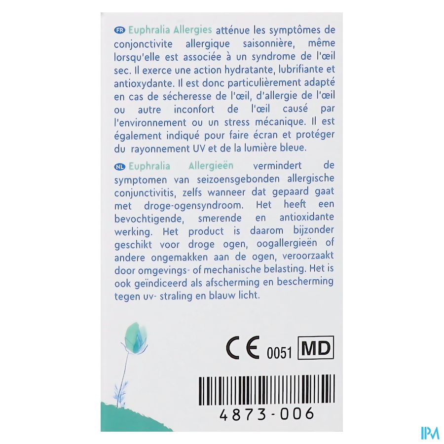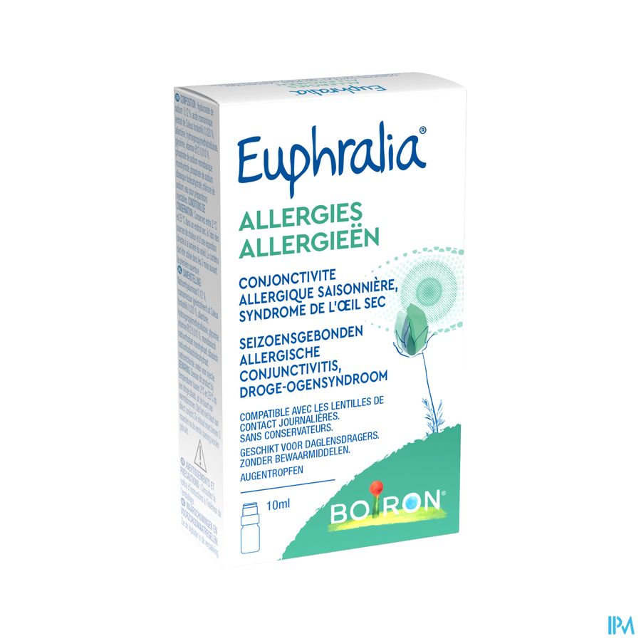 Euphralia Allergieën is een medisch hulpmiddel voor oogheelkundig gebruik. Het is een steriele, conserveermiddelvrije, mediumviskeuze, fysiologische en iso-osmotische oplossing die hyaluronzuur, rosmarinezuur en vitamine B12 bevat. Euphralia Allergieën heeft voornamelijk een hydraterende en smerende werking.