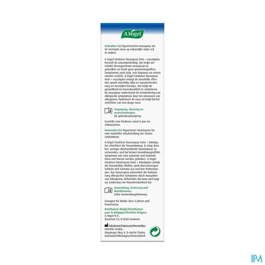 Cinuforce Neusspray forte + eucalyptus is een medisch hulpmiddel dat helpt om je neus op natuurlijke wijze vrij te maken bij neusverkoudheid, allergie of verstopte neus. Dankzij het hoge zoutgehalte (2,7%) reinigt deze hypertone neusspray doeltreffend je neusholtes en vermindert hij klachten zoals jeuk, loopneus en niezen.