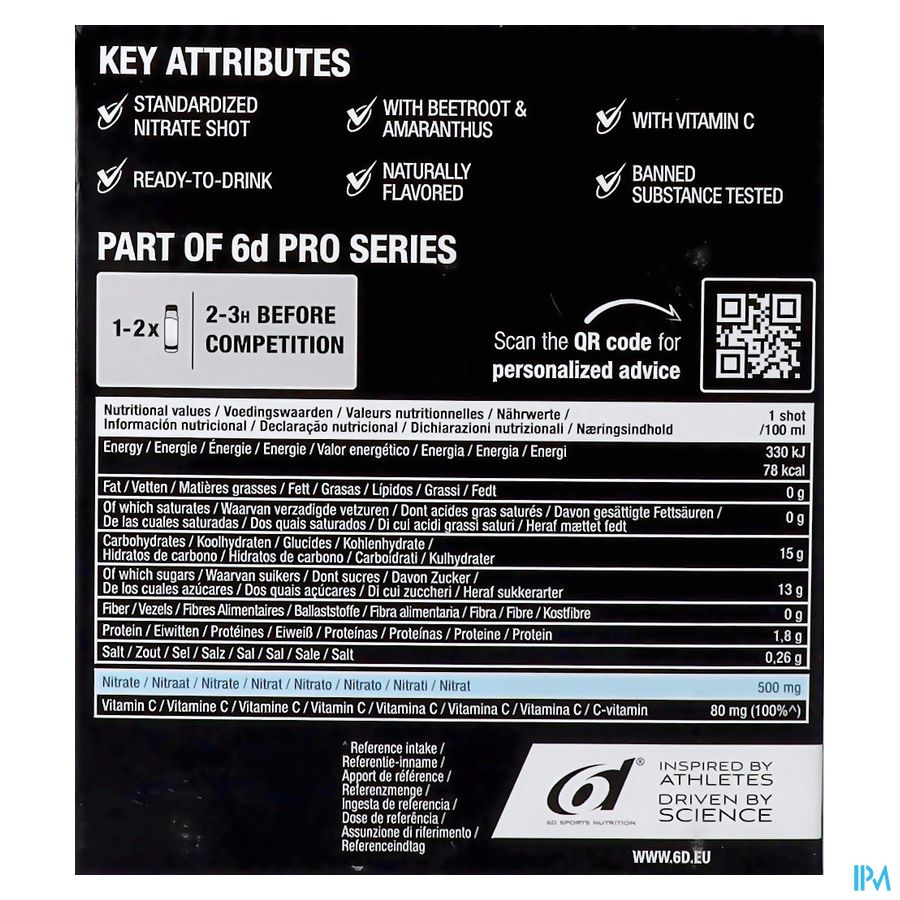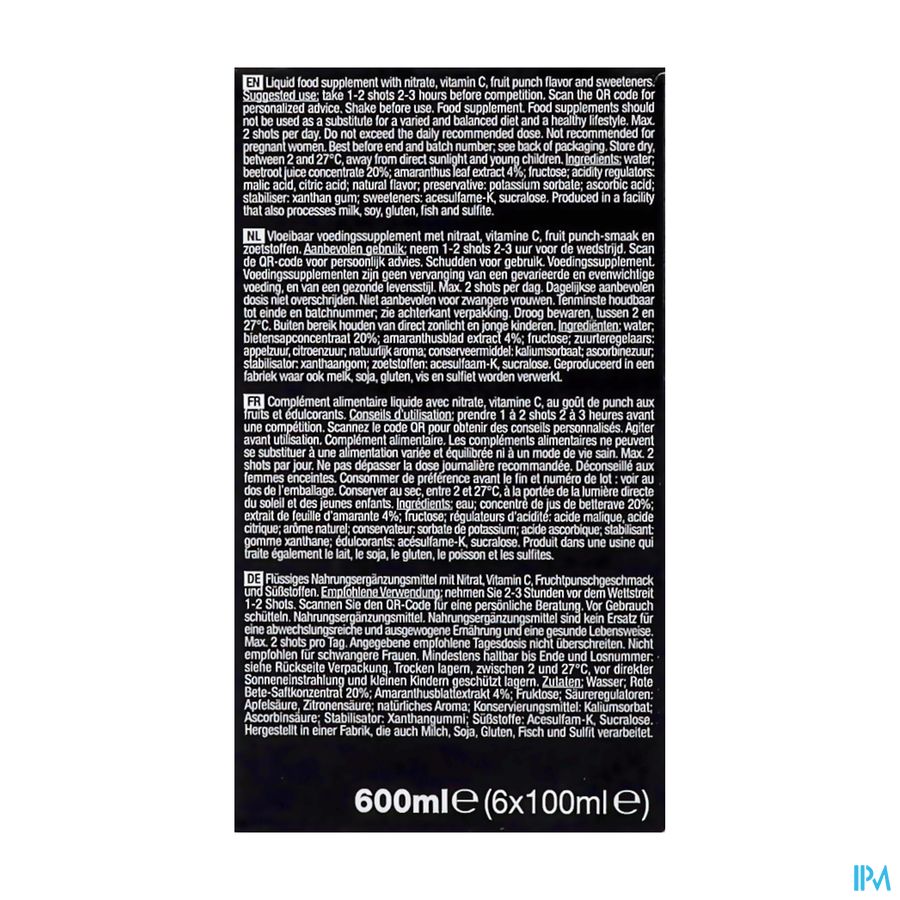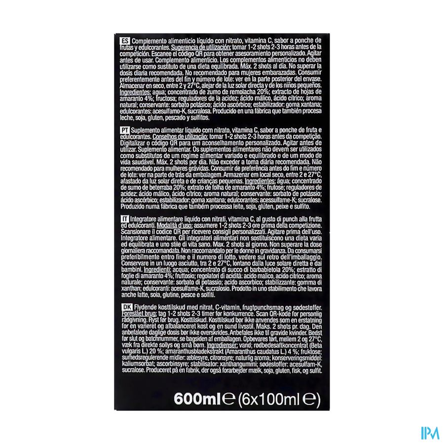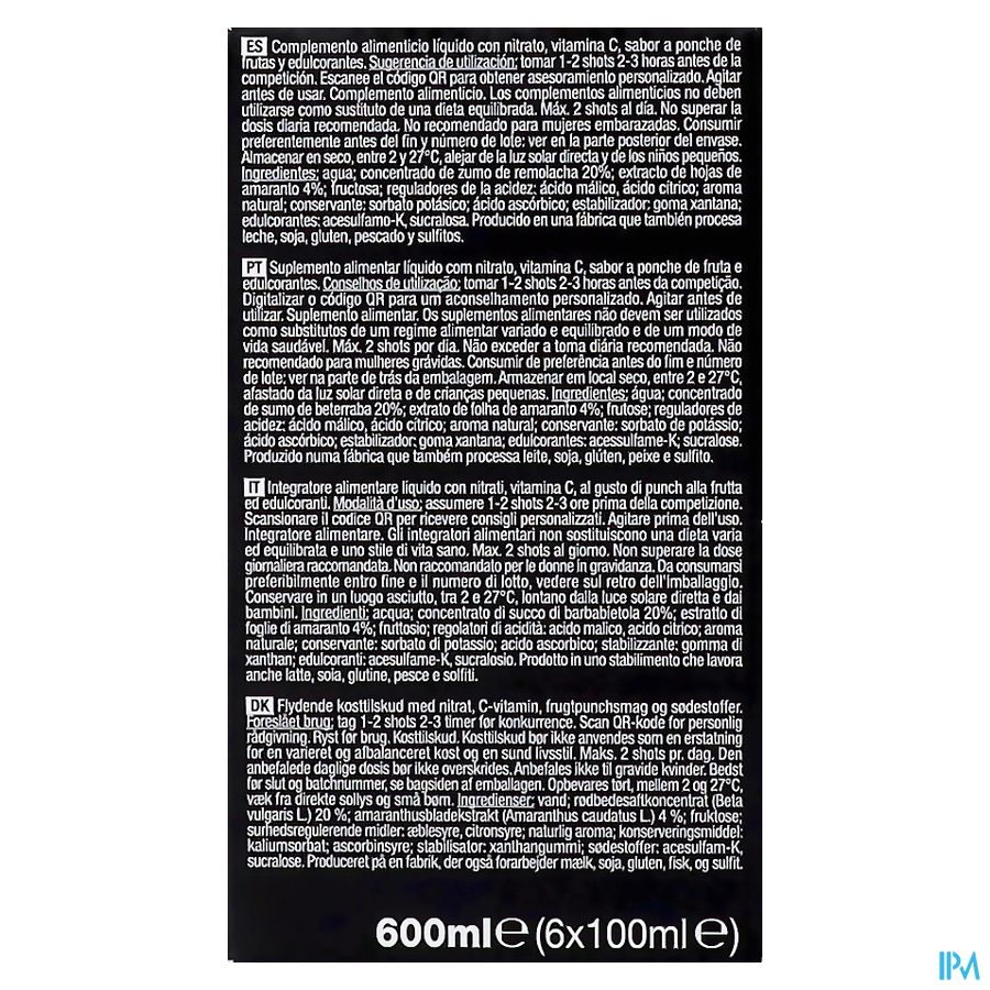 Een gestandaardiseerd en fruitig shot, boordevol plantaardig nitraat uit rode biet en amarant. Zodra nitraat wordt omgezet in stikstofmonoxide (NO), verhoogt het de zuurstoftoevoer naar de spieren en ondersteunt het de spiercontractie. Dit verbetert zowel je uithoudingsvermogen als je sprintprestaties.
