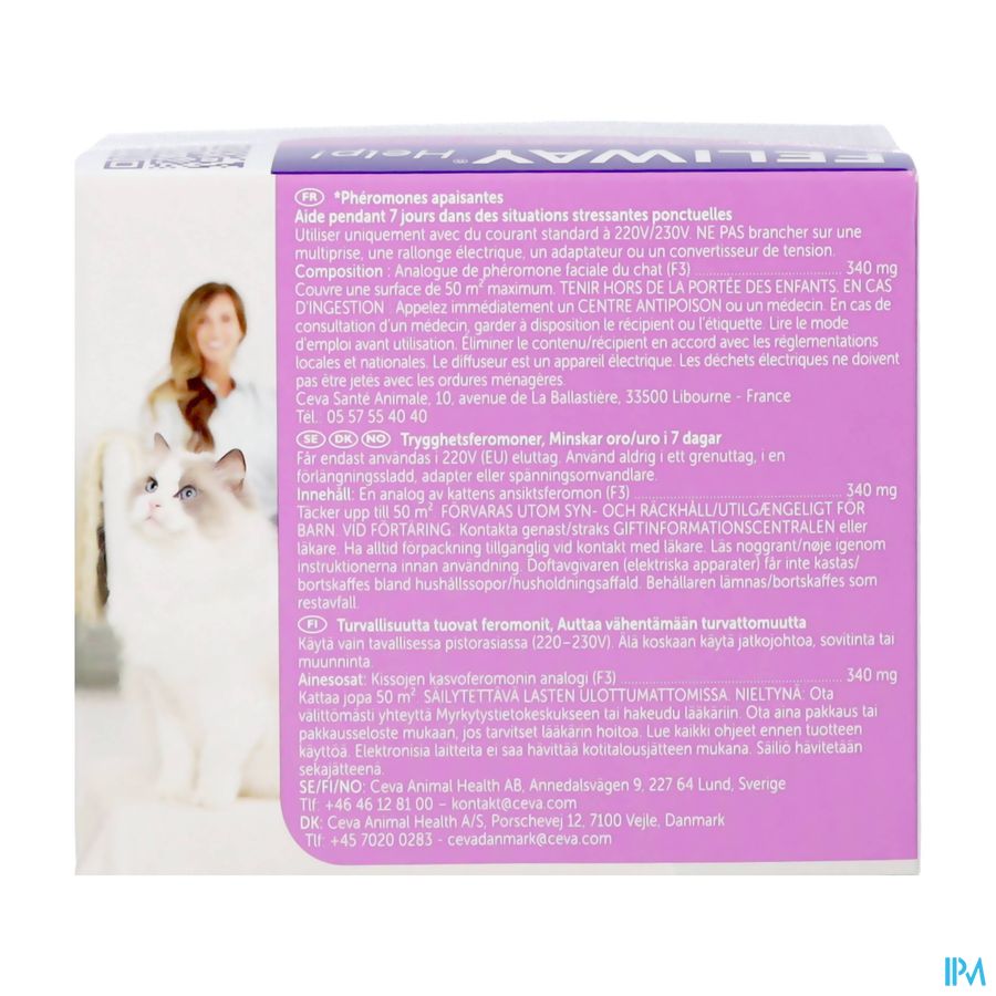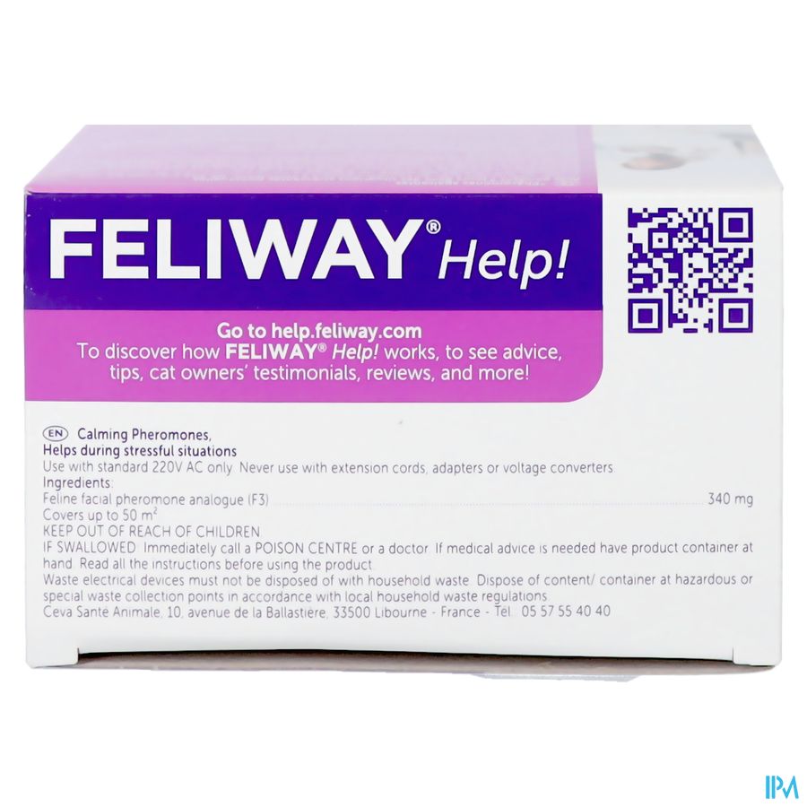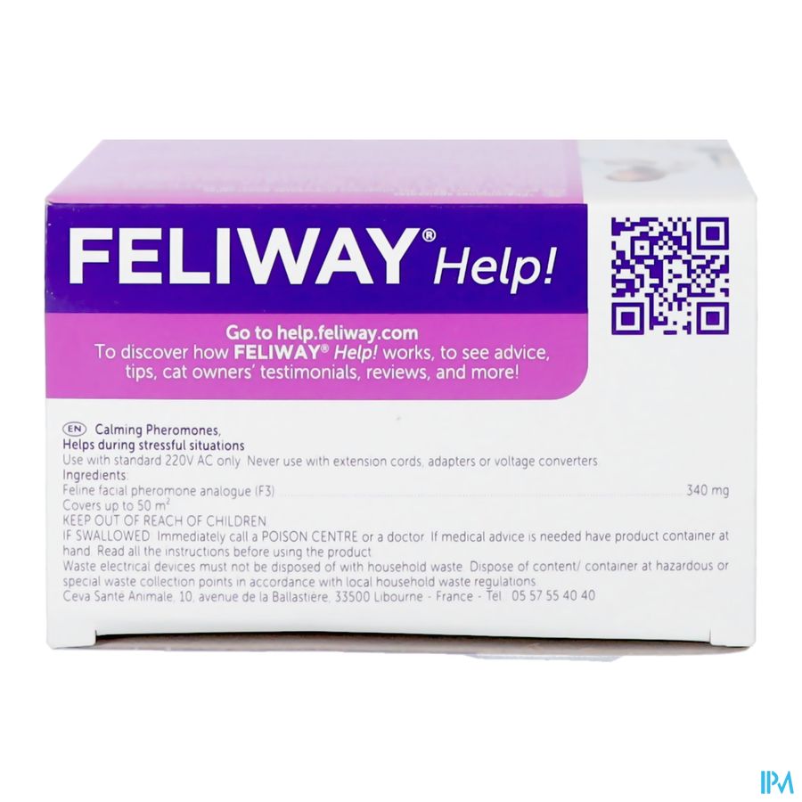 - Plug de FELIWAY Help! verdamper bij voorkeur en indien mogelijk 2 dagen voor de stressvolle situatie in het stopcontact. Zo kan je kat al wennen aan de voorbereidingen die meestal gepaard gaan met een weekendje weg, een gepland feestje, veranderingen in huis of operatie.